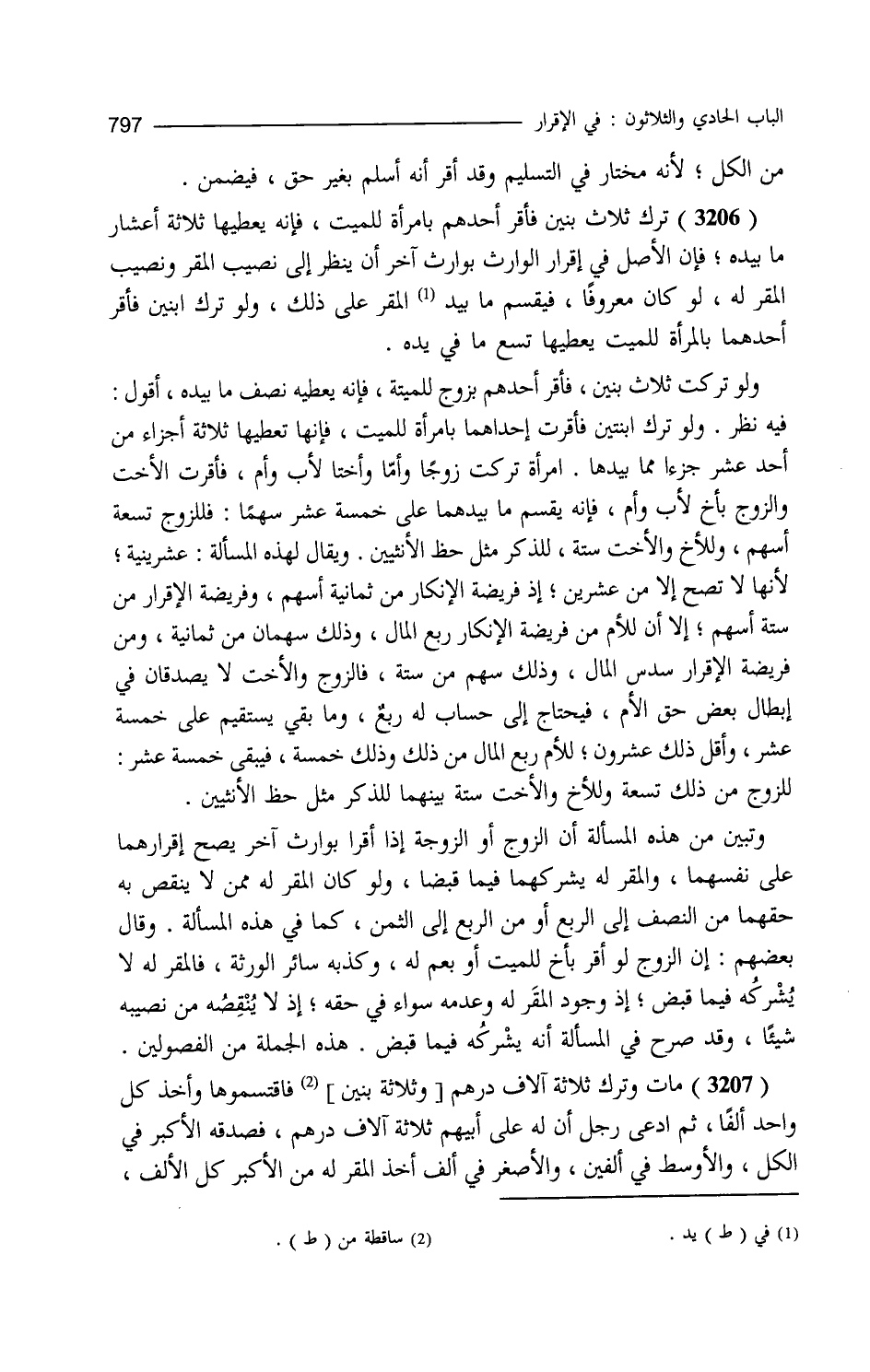 من الكل لأنه مختار في التسليم وقد أقر أنه أسلم بغير حق فيضمن ترك ثلاث بنين فأقر أحدهم بامرأة للميت فإنه يعطيها ثلاثة أعشار ما بيده فإن الأصل في إقرار الوارث بوارث آخر أن ينظر إلى نصيب المقر ونصيب المقر له لو كان معروفا فيقسم ما في يد المقر على ذلك ولو تركت ثلاث بنين فأقر أحدهم بزوج للميتة فإنه يعطيه نصف ما بيده أقول فيه نظر ولو ترك ابنتين فأقرت إحداهما بامرأة للميت فإنها تعطيها ثلاثة أجزاء من أحد عشر جزءا مما بيدها امرأة تركت زوجا وأما وأختا لأب وأم فأقرت الأخت والزوج بأخ لأب وأم فإنه يقسم ما بيدهما على خمسة عشر سهما فللزوج تسعة أسهم وللأخ والأخت ستة للذكر مثل حظ الأنثيين ويقال لهذه المسألة عشرينية لأنها لا تصح إلا من عشرين إذ فريضة الإنكار من ثمانية أسهم وفريضة الإقرار من ستة أسهم إلا أن للأم من فريضة الإنكار ربع المال وذلك سهمان من ثمانية ومن فريضة الإقرار سدس المال وذلك سهم من ستة فالزوج والأخت لا يصدقان في إبطال بعض حق الأم فيحتاج إلى حساب له ربع وما بقي يستقيم على خمسة عشر وأقل ذلك عشرون للأم ربع المال من ذلك وذلك خمسة فيبقى خمسة عشر للزوج من ذلك تسعة وللأخ والأخت ستة بينهما للذكر مثل حظ الأنثيين وتبين من هذه المسألة أن الزوج أو الزوجة إذا أقر بوارث آخر يصح إقرارهما على نفسهما والمقر له يشركهما فيما قبضا ولو كان المقر له ممن لا ينقص به حقهما من النصف إلى الربع أو من الربع إلى الثمن كما في هذه المسألة وقال بعضهم إن الزوج لو أقر بأخ للميت أو بعم له وكذبه سائر الورثة فالمقر له لا يشركه فيما قبض إذ وجود المقر له وعدمه سواء في حقه إذ لا ينقصه من نصيبه شيئا وقد صرح في المسألة أنه يشركه فيما قبض هذه الجملة. من الفصولين. مات وترك ثلاثة آلاف درهم فاقتسموها وأخذ كل واحد ألفا ثم ادعى رجل أن له على أبيهم ثلاثة آلاف درهم فصدقه الأكبر في الكل والأوسط في الألفين والأصغر في ألف أخذ المقر له من الأكبر كل الألف