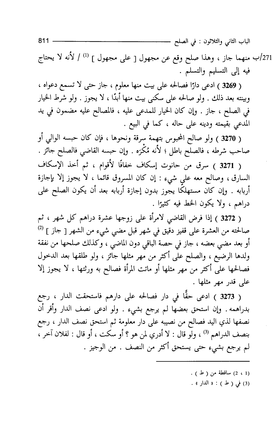 منهما جاز وهذا صلح وقع عن مجهول لأنه لا يحتاج فيه إلى التسليم والتسلم ادعى دارا فصالحه على بيت منها معلوم جاز حتى لا تسمع دعواه وبينته بعد ذلك ولو صالحه على سكنى بيت منها أبدا لا يجوز ولو شرط الخيار في الصلح جاز وإن كان الخيار للمدعى عليه فالمصالح عليه مضمون في يد المدعي بقيمته ودينه على حاله كما في البيع ولو صالح المحبوس بتهمة سرقة ونحوها فإن كان حبسه الوالي أو صاحب شرط فالصلح باطل لأنه مكروه وإن حبسه القاضي فالصلح جائز سرق من حانوت إسكاف خفافا لأقوام ثم أخذ الإسكاف السارق وصالح معه على شيء إن كان المسروق قائما لا يجوز إلا بإجازة أربابه وإن كان مستهلكا يجوز بدون إجازة أربابه بعد أن يكون الصلح على دراهم ولا يكون الحط فيه كثيرا إذا فرض القاضي لامرأة على زوجها عشرة دراهم كل شهر ثم صالحته من العشرة على قفيز دقيق في شهر قبل مضي شيء من الشهر أو بعد مضي بعضه جاز في حصة الباقي دون الماضي وكذلك صلحها من نفقة ولدها الرضيع والصلح على أكثر من مهر مثلها جائز ولو طلقها بعد الدخول فصالحها على أكثر من مهر مثلها أو ماتت المرأة فصالح به ورثتها لا يجوز إلا على قدر مهر مثلها ادعى حقا في دار فصالحه على دار فاستحقت الدار رجع بدراهمه وإن استحق بعضها لم يرجع بشيء ولو ادعى نصف الدار وأقر أن نصفها لذي اليد فصالح من نصيبه على دار معلومة ثم استحق نصف الدار رجع بنصف الدار ولو قال لا أدري لمن هو أو سكت أو قال لفلان آخر لم يرجع بشيء حتى يستحق أكثر من النصف من الوجيز