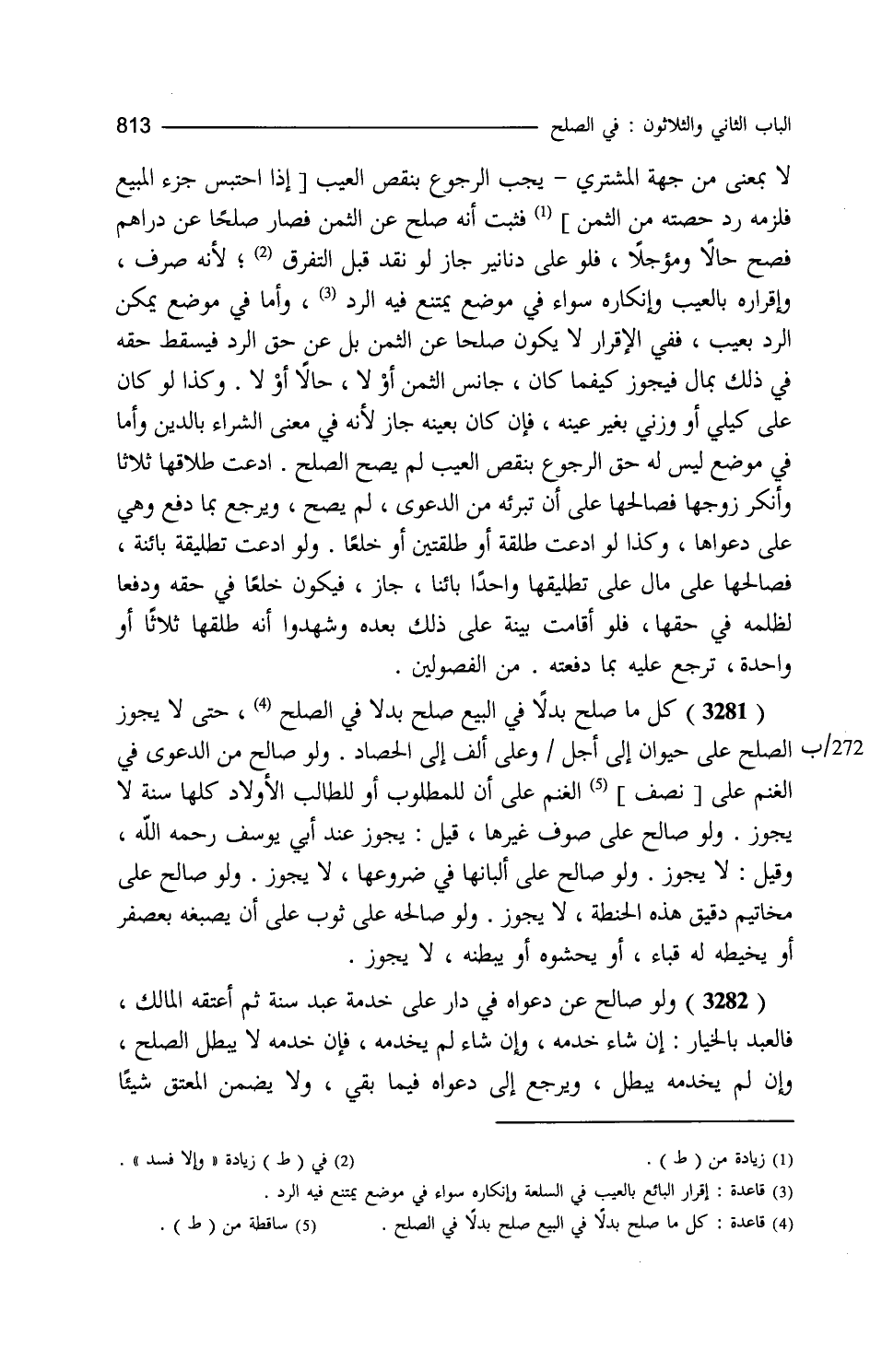 لا بمعنى من جهة المشتري يجب الرجوع بنقص العيب إذ احتبس جزء المبيع فلزمه رد حصته من الثمن فثبت أنه صلح عن الثمن فصار صلحا عن دراهم فصح حالا ومؤجلا فلو على دنانير جاز لو نقد قبل التفرق وإلا فسد لأنه صرف وإقراره بالعيب وإنكاره سواء في موضع يمتنع فيه الرد وأما في موضع يمكن الرد بعيب ففي الإقرار لا يكون صلحا عن الثمن بل عن حق الرد فيسقط حقه في ذلك بمال فيجوز كيفما كان جانس الثمن أو لا حالا أو لا وكذا لو كان على كيلي أو وزني بغير عينه فإن كان بعينه جاز لأنه في معنى الشراء بالدين وأما في موضع ليس له حق الرجوع بنقص العيب لم يصح الصلح ادعت طلاقها ثلاثا وأنكر زوجها فصالحها على أن تبرئه من الدعوى لم يصح ويرجع بما دفع وهي على دعواها وكذا لو ادعت طلقة أو طلقتين أو خلعا ولو ادعت تطليقة بائنا فصالحها على مال على تطليقها واحدا بائنا جاز فيكون خلعا في حقه ودفعا لظلمه في حقها فلو أقامت بينة على ذلك بعده وشهدوا أنه طلقها ثلاثا أو واحدة ترجع عليه بما دفعته. من الفصولين. كل ما صلح بدلا في البيع صلح بدلا في الصلح حتى لا يجوز الصلح على حيوان إلى أجل وعلى ألف إلى الحصاد ولو صالح من الدعوى في الغنم على الغنم على أن للمطلوب أو للطالب الأولاد كلها سنة لا يجوز ولو صالح على صوف غيرها قيل يجوز عند أبي يوسف وقيل لا يجوز ولو صالح على ألبانها في ضروعها لا يجوز ولو صالح على مخاتيم دقيق هذه الحنطة لا يجوز ولو صالحه على ثوب على أن يصبغه بعصفر أو يخيطه له قباء أو يحشوه أو يبطنه لا يجوز ولو صالح عن دعواه في دار على خدمة عبد سنة ثم أعتقه المالك فالعبد بالخيار إن شاء خدمه وإن شاء لم يخدمه فإن خدمه لا يبطل الصلح وإن لم يخدمه يبطل ويرجع إلى دعواه فيما بقي ولا يضمن المعتق شيئا