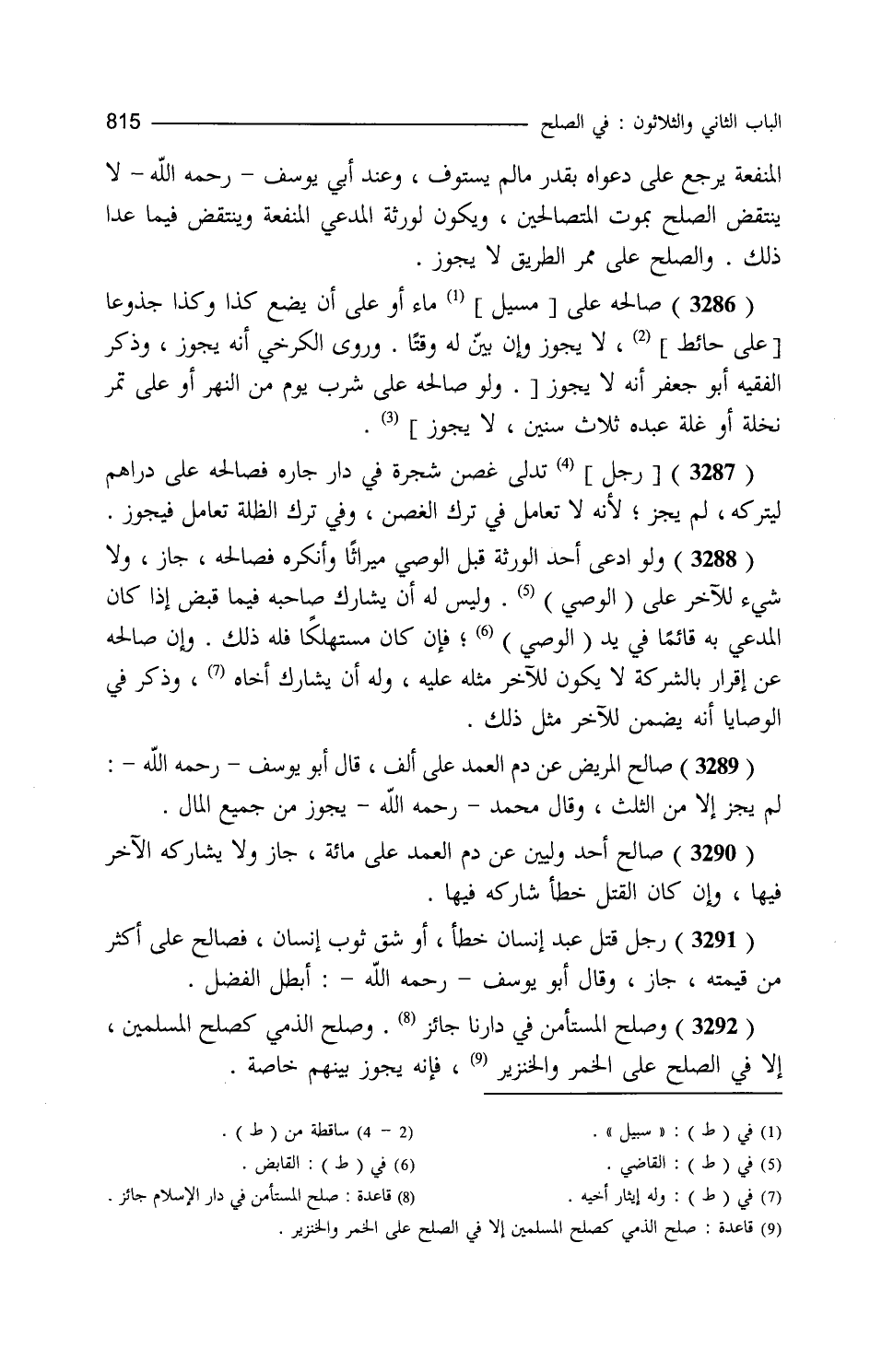 المنفعة يرجع على دعواه بقدر ما لم يستوف وعند أبي يوسف لا ينقض الصلح بموت المتصالحين ويكون لورثة المدعي المنفعة وينتقض فيما عدا ذلك والصلح على ممر الطريق لا يجوز صالحه على سبيل ماء أو على أن يضع كذا وكذا جذوعا لا يجوز وإن بين له وقتا وروى الكرخي أنه يجوز وذكر الفقيه أبو جعفر أنه لا يجوز تدلى غصن شجرة في دار جاره فصالحه على دراهم ليتركه لم يجز لأنه لا تعامل في ترك الغصن وفي ترك الظلة تعامل فيجوز ولو ادعى أحد الورثة قبل القاضي ميراثا وأنكره فصالحه جاز ولا شيء للآخر على القاضي وليس له أن يشارك صاحبه فيما قبض إذا كان المدعى به قائما في يد القابض فإن كان مستهلكا فله ذلك وإن صالحه عن إقرار بالشركة لا يكون للآخر مثله عليه وله إيثار أخيه وذكر في الوصايا أنه يضمن للآخر مثل ذلك صالح المريض عن قتل العمد على ألف قال أبو يوسف لم يجز إلا من الثلث وقال محمد يجوز من جميع المال صالح أحد وليين عن دم العمد على مائة جاز ولا يشاركه الآخر فيها وإن كان القتل خطأ شاركه فيها رجل قتل عبد إنسان خطأ أو شق ثوب إنسان فصالح على أكثر من قيمته جاز وقال أبو يوسف أبطل الفضل وصلح المستأمن في دارنا جائز وصلح الذمي كصلح المسلمين إلا في الصلح على الخمر والخنزير فإنه يجوز بينهم خاصة
