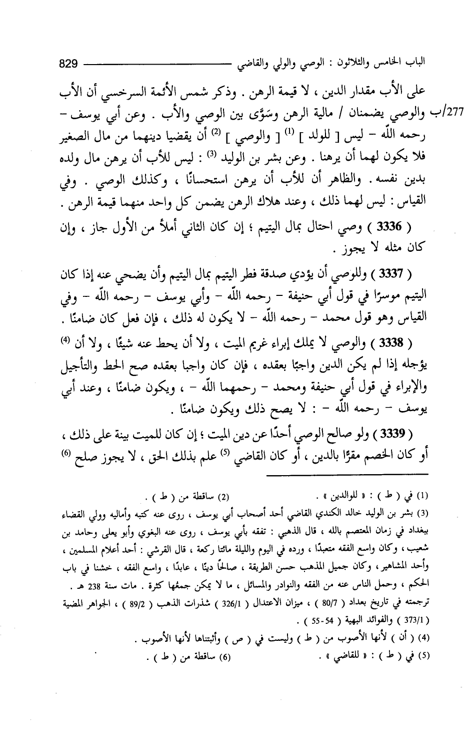 على الأب مقدار الدين لا قيمة الرهن وذكر شمس الأئمة السرخسي أن الأب والوصي يضمنان مالية الرهن وسوى بين الوصي والأب وعن أبي يوسف ليس للوالدين أن يقضيا دينهما من مال الصغير فلا يكون لهما أن يرهنا وعن بشر بن الوليد ليس للأب أن يرهن مال ولده بدين نفسه والظاهر أن للأب أن يرهن استحسانا وكذلك الوصي وفي القياس ليس لهما ذلك وعند هلاك الرهن يضمن كل واحد منهما قيمة الرهن وصي احتال بمال اليتيم إن كان الثاني أملأ من الأول جاز وإن كان مثله لا يجوز وللوصي أن يؤدي صدقة فطر اليتيم بمال اليتيم وأن يضحي عنه إذا كان اليتيم موسرا في قول أبي حنيفة وأبي يوسف وفي القياس وهو قول محمد لا يكون له ذلك فإن فعل كان ضامنا والوصي لا يملك إبراء غريم الميت ولا أن يحط عنه شيئا ولا أن يؤجله إذا لم يكن الدين واجبا بعقده فإن كان واجبا بعقده صح الحط والتأجيل والإبراء في قول أبي حنيفة ومحمد ويكون ضامنا وعند أبي يوسف لا يصح ذلك ويكون ضامنا ولو صالح الوصي أحدا عن دين الميت إن كان للميت بينة على ذلك أو كان الخصم مقرا بالدين أو كان للقاضي علم بذلك الحق لا يجوز