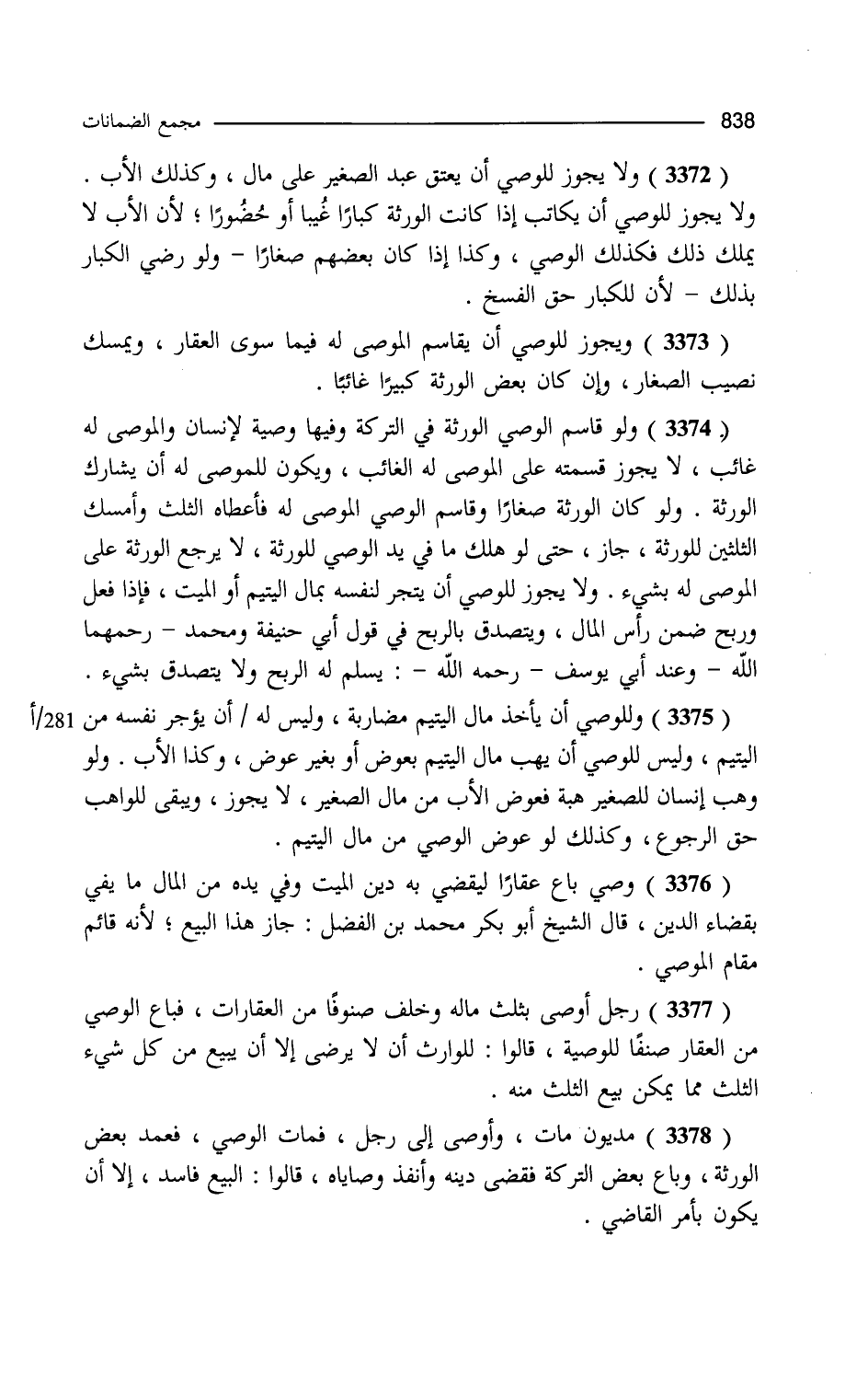 ولا يجوز للوصي أن يعتق عبد الصغير على مال وكذلك الأب ولا يجوز للوصي أن يكاتب إذا كانت الورثة كبارا غيبا أو حضورا لأن الأب لا يملك ذلك فكذلك الوصي وكذا إذا كان بعضهم صغارا ولو رضي الكبار بذلك لأن للكبار حق الفسخ ويجوز للوصي أن يقاسم الموصى له فيما سوى العقار ويمسك نصيب الصغار وإن كان بعض الورثة كبيرا غائبا ولو قاسم الوصي الورثة في التركة وفيها وصية لإنسان والموصى له غائب لا يجوز قسمته على الموصى له الغائب ويكون للموصى له أن يشارك الورثة ولو كان الورثة صغارا وقاسم الوصي الموصى له فأعطاه الثلث وأمسك الثلثين للورثة جاز حتى لو هلك ما في يد الوصي للورثة لا يرجع الورثة على الموصى له بشيء ولا يجوز للوصي أن يتجر لنفسه بمال اليتيم أو الميت فإذا فعل وربح ضمن رأس المال ويتصدق بالربح في قول أبي حنيفة ومحمد وعند أبي يوسف يسلم له الربح ولا يتصدق بشيء وللوصي أن يأخذ مال اليتيم مضاربة وليس له أن يؤجر نفسه من اليتيم وليس للوصي أن يهب مال اليتيم بعوض أو بغير عوض وكذا الأب ولو وهب إنسان للصغير هبة فعوض الأب من مال الصغير لا يجوز ويبقى للواهب حق الرجوع وكذلك لو عوض الوصي من مال اليتيم وصي باع عقارا ليقضي به دين الميت وفي يده من المال ما يفي بقضاء الدين قال الشيخ أبو بكر محمد بن الفضل جاز هذا البيع لأنه قائم مقام الموصي رجل أوصى بثلث ماله وخلف صنوفا من العقارات فباع الوصي من العقار صنفا للوصية قالوا للوارث أن لا يرضى إلا أن يبيع من كل شيء الثلث مما يمكن بيع الثلث منه مديون مات وأوصى إلى رجل فمات الوصي فعمد بعض الورثة وباع بعض التركة فقضى دينه وأنفذ وصاياه قالوا البيع فاسد إلا أن يكون بأمر القاضي