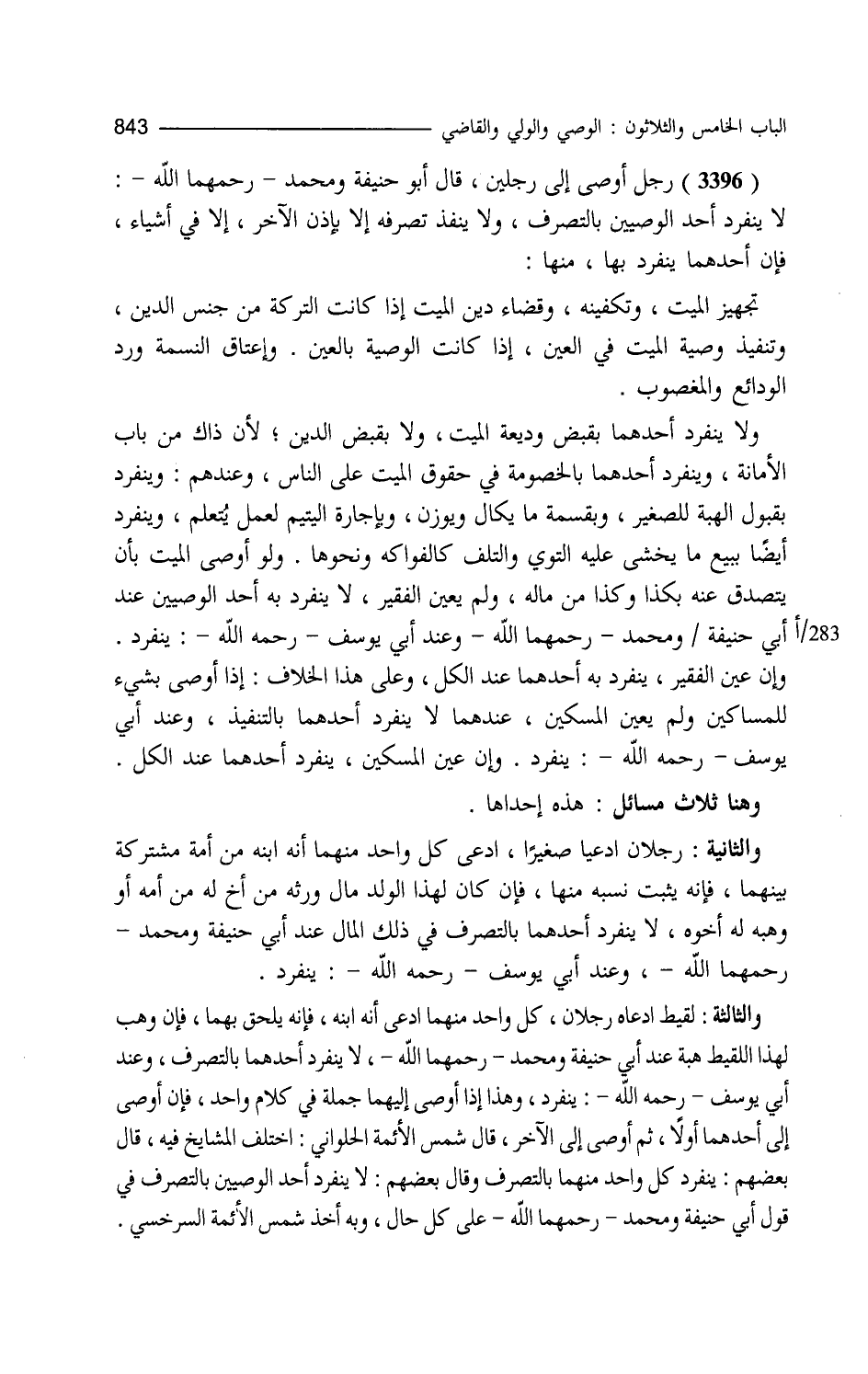 رجل أوصى إلى رجلين قال أبو حنيفة ومحمد لا ينفرد أحد الوصيين بالتصرف ولا ينفذ تصرفه إلا بإذن الآخر إلا في أشياء فإن أحدهما ينفرد بها منها تجهيز الميت وتكفينه وقضاء دين الميت إذا كانت التركة من جنس الدين وتنفيذ وصية الميت في العين إذا كانت الوصية بالعين وإعتاق النسمة ورد الودائع والمغصوب ولا ينفرد أحدهما بقبض وديعة الميت ولا بقبض الدين لأن ذاك من باب الأمانة وينفرد أحدهما بالخصومة في حقوق الميت على الناس وعندهم وينفرد بقبول الهبة للصغير وبقسمة ما يكال ويوزن وبإجارة اليتيم لعمل يتعلمه وينفرد أيضا ببيع ما يخشى عليه التوى والتلف كالفواكه ونحوها ولو أوصى الميت بأن يتصدق عنه بكذا وكذا من ماله ولم يعين الفقير لا ينفرد به أحد الوصيين عند أبي حنيفة ومحمد وعند أبي يوسف ينفرد وإن عين الفقير ينفرد به أحدهما عند الكل وعلى هذا الخلاف إذا أوصى بشيء للمساكين ولم يعين المسكين عندهما لا ينفرد أحدهما بالتنفيذ وعند أبي يوسف ينفرد وإن عين المسكين ينفرد أحدهما عند الكل وهنا ثلاث مسائل هذه إحداهما والثانية رجلان ادعيا صغيرا ادعى كل واحد منهما أنه ابنه من أمة مشتركة بينهما فإنه يثبت نسبه منهما فإن كان لهذا الولد مال ورثه من أخ له من أمة أو وهبه له أخوه لا ينفرد أحدهما بالتصرف في ذلك المال عند أبي حنيفة ومحمد وعند أبي يوسف ينفرد والثالثة لقيط ادعاه رجلان كل واحد منهما ادعى أنه ابنه فإنه يلحق بهما فإن وهب لهذا اللقيط هبة عند أبي حنيفة ومحمد لا ينفرد أحدهما بالتصرف وعند أبي يوسف ينفرد وهذا إذا أوصى إليهما جملة في كلام واحد فإن أوصى إلى أحدهما ثم أوصى إلى الآخر قال شمس الأئمة الحلواني اختلف المشايخ فيه قال بعضهم ينفرد كل واحد منهما بالتصرف في قول أبي حنيفة ومحمد على كل حال وبه أخذ شمس الأئمة السرخسي
