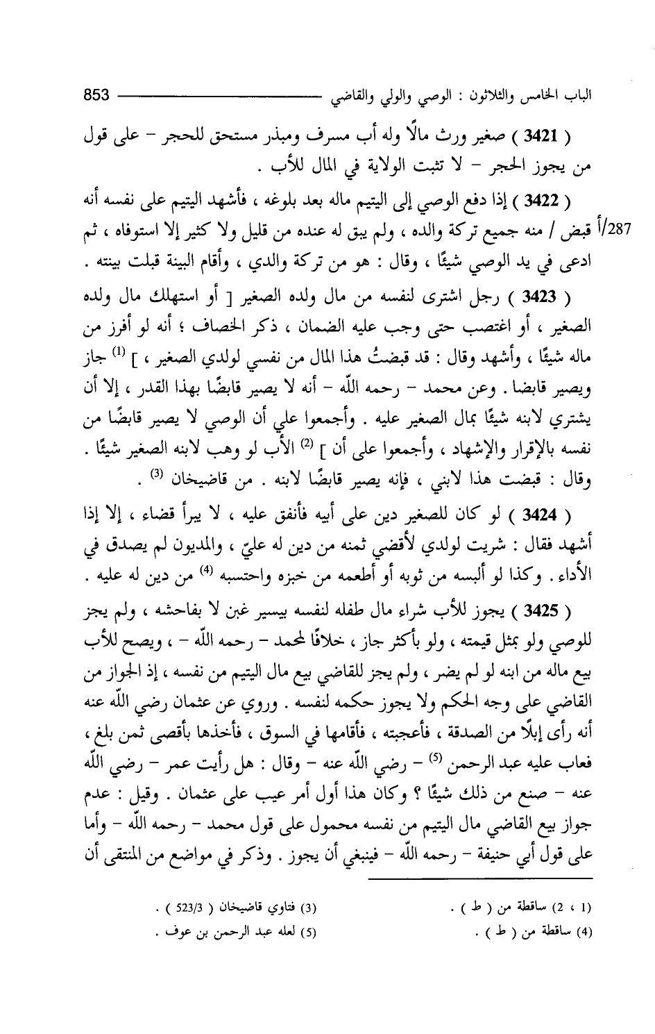 صغير ورث مالا وله أب مسرف ومبذر مستحق للحجر على قول من يجوز الحجر لا تثبت الولاية في المال للأب إذا دفع الوصي إلى اليتيم ماله بعد بلوغه فأشهد اليتيم على نفسه أنه قبض منه جميع تركة والده ولم يبق له عنده من قليل ولا كثير إلا استوفاه ثم ادعى في يد الوصي شيئا وقال هو من تركة والدي وأقام البينة قبلت بينته رجل اشترى لنفسه من مال ولده الصغير جاز ويصير قابضا وعن محمد أنه لا يصير قابضا بهذا القدر إلا أن يشتري لابنه شيئا بمال الصغير عليه وأجمعوا على أن الأب لو وهب لابنه الصغير شيئا وقال قبضت هذا لابني فإنه يصير قابضا لابنه. من قاضي خان. لو كان للصغير دين على أبيه فأنفق عليه لا يبرأ قضاء إلا إذا شهد فقال شريت لولدي لأقضي ثمنه من دين له علي والمديون لم يصدق في الأداء وكذا لو ألبسه من ثوبه أو أطعمه من خبزه من دين له عليه يجوز للأب شراء مال طفله لنفسه بيسير غبن لا بفاحش ولم يجز للوصي ولو بمثل قيمته ولو بأكثر جاز خلافا لمحمد ويصح للأب بيع ماله من ابنه لو لم يضر ولم يجز للقاضي بيع مال اليتيم من نفسه إذ الجواز من القاضي على وجه الحكم ولا يجوز حكمه لنفسه وروي عن عثمان رضي الله عنه أنه رأى إبلا من الصدقة فأعجبته فأقامها في السوق فأخذها بأقصى ثمن بلغ فعاب عليه عبد الرحمن وقال هل رأيت عمر صنع من ذلك شيئا وكان هذا أول أمر عيب على عثمان وقيل عدم جواز بيع القاضي مال اليتيم من نفسه محمول على قول محمد وأما على قول أبي حنيفة فينبغي أن يجوز وذكر في موضع من المنتقى أن