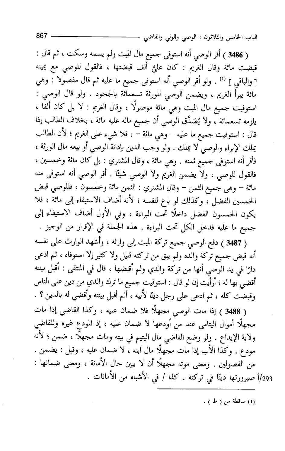 أقر الوصي أنه استوفى جميع مال الميت ولم يسمه وسكت ثم قال قبضت مائة وقال الغريم كان على ألف قبضتها فالقول للوصي مع يمينه ولو أقر الوصي أنه استوفى جميع ما عليه ثم قال مفصولا وهي مائة يبرأ الغريم ويضمن الوصي للورثة تسعمائة بالجحود ولو قال الوصي استوفيت جميع مال الميت وهي مائة موصولا وقال الغريم لا بل كان ألفا يلزمه تسعمائة ولا يصدق الوصي أن جميع ما له عليه مائة بخلاف الطالب إذا قال استوفيت جميع ما عليه وهي مائة فلا شيء على الغريم لأن الطالب يملك الإبراء والوصي لا يملك ولو وجب الدين بإدانة الوصي أو بيعه مال الورثة فأقر أنه استوفى جميع ثمنه وهي مائة وقال المشتري بل كان مائة وخمسين فالقول للوصي ولا يضمن الغريم ولا الوصي شيئا أقر الوصي أنه استوفى منه مائة وهي جميع الثمن وقال المشتري الثمن مائة وخمسون فللوصي قبض الخمسين الفضل وكذلك لو باع لنفسه لأنه أضاف الاستيفاء إلى مائة فلا يكون الخمسون الفضل داخلا تحت البراءة وفي الأول أضاف الاستيفاء إلى جميع ما عليه فدخل الكل تحت البراءة هذه الجملة في الإقرار. من الوجيز. دفع الوصي جميع تركة الميت إلى وارثه وأشهد الوارث على نفسه أنه قبض جميع تركة والده ولم يبق من تركته قليل ولا كثير إلا استوفاه ثم ادعى دارا في يد الوصي أنها من تركة والدي ولم أقبضها قال في المنتقى أقبل بينته أقضي بها له أرأيت أن لو قال استوفيت جميع ما ترك والدي من دين على الناس وقبضت كله ثم ادعى على رجل دينا لأبيه ألم أقبل بينته وأقضي له بالدين إذا مات الوصي مجهلا فلا ضمان عليه وكذا القاضي إذا مات مجهلا أموال اليتامى عند من أودعها لا ضمان عليه إذ المودع غيره وللقاضي ولاية الإيداع ولو وضع القاضي مال اليتيم في بيته ومات مجهلا ضمن لأنه مودع وكذا الأب إذا مات مجهلا مال ابنه لا ضمان عليه وقيل يضمن. من الفصولين. ومعنى موته مجهلا أن لا يبين حال الأمانة ومعنى ضمانها صيرورتها دينا في تركته كذا في الأشباه من الأمانات