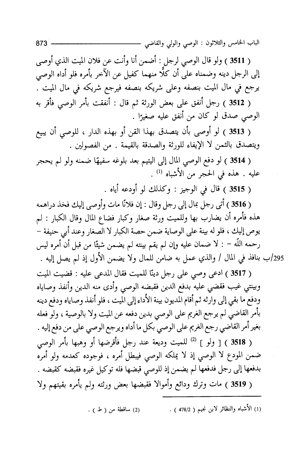 ولو قال الوصي لرجل أضمن أنا وأنت عن فلان الميت الذي أوصى إلي لرجل دينه وضمناء على أن كلا منهما كفيل عن الآخر بأمره فلو أداه الوصي يرجع في مال الميت بنصفه وعلى شريكه بنصفه فيرجع شريكه في مال الميت رجل أنفق على بعض الورثة ثم قال أنفقت بأمر الوصي فأقر به الوصي صدق لو كان من أنفق عليه صغيرا لو أوصى بأن يتصدق بهذا القن أو بهذه الدار للوصي أن يبيع ويتصدق بالثمن لا الإيفاء للورثة والصدقة بالقيمة. من الفصولين. لو دفع الوصي المال إلى اليتيم بعد بلوغه سفيها ضمنه ولو لم يحجر عليه هذه في الحجر. من الأشباه.قال في الوجيز وكذلك لو أودعه إياه أتى رجل بمال إلى رجل وقال إن فلانا مات وأوصى إليك فخذ الدراهم هذه فأمره أن يضارب بها وللميت ورثة صغار وكبار فضاع المال وقال الكبار لم يوص إليك فلو له بينة على الوصاية ضمن حصة الكبار لا الصغار وعند أبي حنيفة لا ضمان عليه وإن لم يقم بينة لم يضمن شيئا من قبل أن أمره ليس بنافذ في المال والذي عمل به ضامن للمال ولا يضمن الأول إذ لم يصل إليه ادعى وصي على رجل دينا للميت فقال المدعى عليه قضيت الميت وبينتي غيب فقضي عليه بدفع الدين فقبضه الوصي وأدى منه الدين وأنفذ وصاياه ودفع ما بقي إلى وارثه ثم أقام المديون بينة الأداء إلى الميت فلو أنفذ وصاياه ودفع دينه بأمر القاضي لم يرجع الغريم على الوصي بدين دفعه عن الميت ولا بالوصية ولو فعله بغير أمر القاضي رجع الغريم على الوصي بكل ما أداه ويرجع الوصي على من دفع إليه للميت وديعة عند رجل فأقرضها أو وهبها بأمر الوصي ضمن المودع لا الوصي إذ لا يملكه الوصي فيبطل أمره فوجوده كعدمه ولو أمره بدفعها إلى رجل فدفعها لم يضمن إذ للوصي قبضها فله توكيل غيره فقبضه كقبضه مات وترك ودائع وأموالا فقبضها بعض ورثته ولم يأمره بقيتهم ولا