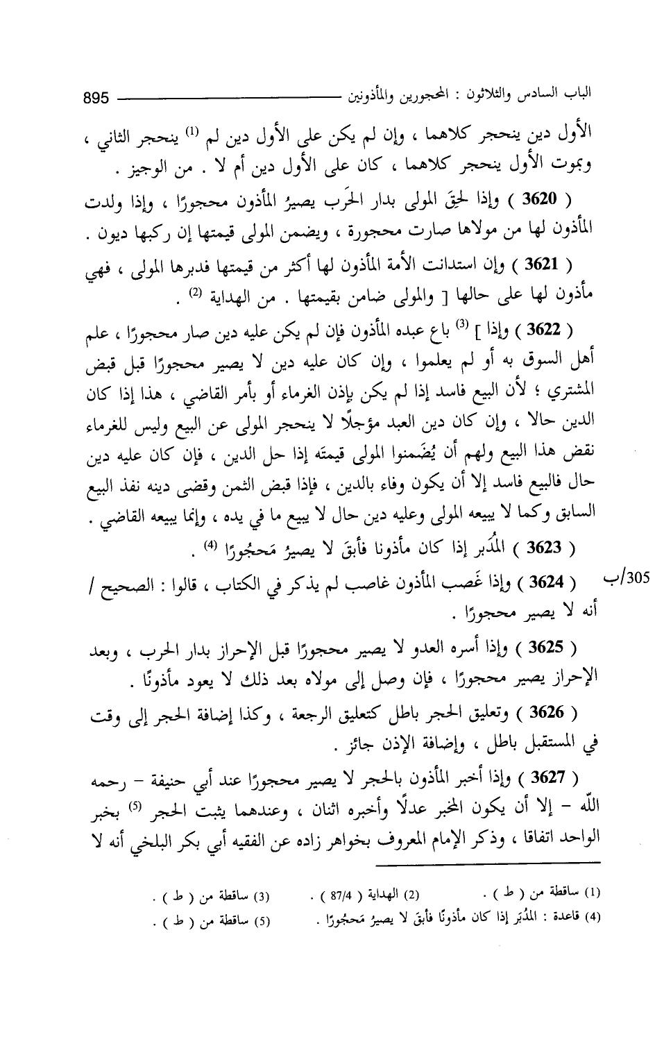 الأول دين ينحجر كلاهما وإن لم يكن على الأول دين ينحجر الثاني وبموت الأول ينحجر كلاهما كان على الأول دين أم لا. من الوجيز. وإذا لحق المولى بدار الحرب يصير المأذون محجورا وإذا ولدت المأذون لها من مولاها صارت محجورة ويضمن المولى قيمتها إن ركبها ديون وإن استدانت الأمة المأذون لها أكثر من قيمتها فدبرها المولى فهي مأذون لها على حالها باع عبده المأذون فإن لم يكن عليه دين صار محجورا علم أهل السوق به أو لم يعلموا وإن كان عليه دين لا يصير محجورا قبل قبض المشتري لأن البيع فاسد إذا لم يكن بإذن الغرماء أو بأمر القاضي هذا إذا كان الدين حالا وإن كان دين العبد مؤجلا لا ينحجر المولى عن البيع وليس للغرماء نقض هذا البيع ولهم أن يضمنوا المولى قيمته إذا حل الدين فإن كان عليه دين حال فالبيع فاسد إلا أن يكون أوفى بالدين فإذا قبض الثمن وقضى دينه نفذ البيع السابق وكما لا يبيعه المولى وعليه دين حال لا يبيع ما في يده وإنما يبيعه القاضي المدبر إذا كان مأذونا فأبق لا يصير محجورا وإذا غصب المأذون غاصب لم يذكر في الكتاب قالوا الصحيح أنه لا يصير محجورا وإذا أسره العدو لا يصير محجورا قبل الإحراز بدار الحرب وبعد الإحراز يصير محجورا فإن وصل إلى مولاه بعد ذلك لا يعود مأذونا وتعليق الحجر باطل كتعليق الرجعة وكذا إضافة الحجر إلى وقت في المستقبل باطل وإضافة الإذن جائز وإذا أخبر المأذون بالحجر لا يصير محجورا عند أبي حنيفة إلا أن يكون المخبر عدلا أو أخبره اثنان وعندهما يثبت بخبر الواحد اتفاقا وذكر الإمام المعروف بخواهر زاده عن الفقيه أبي بكر البلخي أنه لا
