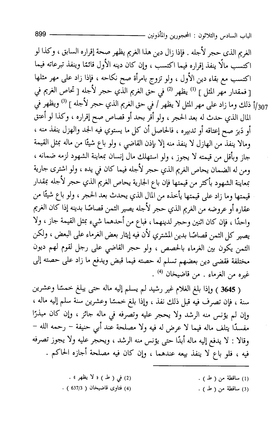 الغريم الذي حجر لأجله فإذا زال دين هذا الغريم يظهر صحة إقراره السابق وكذا لو اكتسب مالا ينفد إقراره فيما اكتسب وإن كان دينه الأول قائما وينفذ تبرعاته فيما اكتسب مع بقاء دينه الأول ولو تزوج بامرأة صح نكاحه فإذا زاد على مهر مثلها لا يظهر في حق الغريم الذي حجر لأجله ويظهر في المال الذي حدث له بعد الحجر ولو أقر بحد أو قصاص صح إقراره وكذا لو أعتق أو دبر صح إعتاقه أو تدبيره فالحاصل أن كل ما يستوي فيه الجد والهزل ينفذ منه وما لا ينفذ من الهازل لا ينفذ منه إلا بإذن القاضي ولو باع شيئا من ماله بمثل القيمة جاز وبأقل من قيمته لا يجوز ولو استهلك مال إنسان بمعاينة الشهود لزمه ضمانه ومن له الضمان يحاص الغريم الذي حجر لأجله فيما كان في يده ولو اشترى جارية بمعاينة الشهود بأكثر من قيمتها فإن باع الجارية يحاص الغريم الذي حجر لأجله بمقدار قيمتها وما زاد على قيمتها يأخذه من المال الذي يحدث بعد الحجر ولو باع شيئا من عقاره أو عروضه من الغريم الذي حجر لأجله يصير الثمن قصاصا بدينه إذا كان الغريم واحدا فإن كان اثنين وحجر لدينهما فباع من أحدهما شيئا بمثل القيمة جاز ولا يصير كل الثمن قصاصا بدين المشتري لأن فيه إيثار بعض الغرماء على البعض ولكن الثمن يكون بين الغرماء بالحصص ولو حجر القاضي على رجل لقوم لهم ديون مختلفة فقضى دين بعضهم تسلم له حصته فيما قبض ويدفع ما زاد على حصته إلى غيره من الغرماء. من قاضي خان. وإذا بلغ الغلام غير رشيد لم يسلم إليه ماله حتى يبلغ خمسا وعشرين سنة فإن تصرف فيه قبل ذلك نفذ وإذا بلغ خمسا وعشرين سنة سلم إليه ماله وإن لم يؤنس منه الرشد ولا يحجر عليه وتصرفه في ماله جائز وإن كان مبذرا مفسدا يتلف ماله فيما لا غرض له فيه ولا مصلحة عند أبي حنيفة وقالا لا يدفع إليه ماله أبدا حتى يؤنس الرشد ويحجر عليه ولا يجوز تصرفه فيه فلو باع لا ينفذ بيعه عندهما وإن كان فيه مصلحة أجازه الحاكم