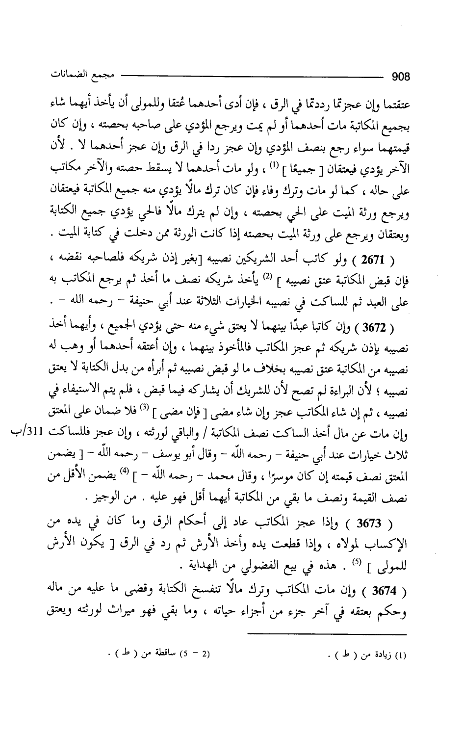 عتقتما وإن عجزتما رددتما في الرق فإن أدى أحدهما عتقا وللمولى أن يأخذ أيهما شاء بجميع المكاتبة مات أحدهما أو لم يمت ويرجع المؤدي على صاحبه بحصته وإن كان قيمتهما سواء رجع بنصف المؤدى وإن عجزا ردا في الرق وإن عجز أحدهما لا لأن الآخر يؤدي فيعتقان جميعا ولو مات أحدهما لا يسقط حصته والآخر مكاتب على حاله كما لو مات وترك وفاء فإن كان ترك مالا يؤدى منه جميع المكاتبة فيعتقان ويرجع ورثة الميت على الحي بحصته وإن لم يترك مالا فالحي يؤدي جميع الكتابة ويعتقان ويرجع على ورثة الميت بحصته إذا كانت الورثة ممن دخلت في كتابة الميت ولو كاتب أحد الشريكين نصيبه يأخذ شريكه نصف ما أخذ ثم يرجع المكاتب به على العبد ثم للساكت في نصيبه الخيارات الثلاث عند أبي حنيفة وإن كاتبا عبدا بينهما لا يعتق شيء منه حتى يؤدي الجميع وأيهما أخذ نصيبه بإذن شريكه ثم عجز المكاتب فالمأخوذ بينهما وإن أعتقه أحدهما أو وهب له نصيبه من المكاتبة عتق نصيبه بخلاف ما لو قبض نصيبه ثم أبرأه من بدل الكتابة لا يعتق نصيبه لأن البراءة لم تصح لأن للشريك أن يشاركه فيما قبض فلم يتم الاستيفاء في نصيبه ثم إن شاء المكاتب عجز وإن شاء مضى فلا ضمان على المعتق وإن مات عن مال أخذ الساكت نصف المكاتبة والباقي لورثته وإن عجز للساكت ثلاث خيارات عند أبي حنيفة وقال أبو يوسف يضمن الأقل من نصف القيمة ونصف ما بقي من المكاتبة أيهما أقل فهو عليه. من الوجيز. وإذا عجز المكاتب عاد إلى أحكام الرق وما كان في يده من الأكساب لمولاه وإذا قطعت يده وأخذ الأرش فهو للمولى هذه في بيع الفضولي. من الهداية. وإن مات المكاتب وترك مالا لا تنفسخ الكتابة وقضى ما عليه من ماله وحكم بعتقه في آخر جزء من أجزاء حياته وما بقي فهو ميراث لورثته ويعتق