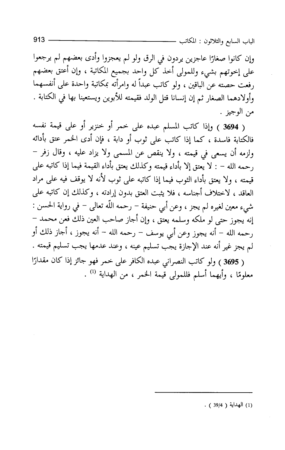وإن كانوا صغارا عاجزين يردون في الرق ولو لم يعجزوا وأدى بعضهم لم يرجعوا على إخوتهم بشيء وللمولى أخذ كل واحد بجميع المكاتبة وإن أعتق بعضهم رفعت حصته عن الباقين ولو كاتب عبدا له وامرأته بمكاتبة واحدة على أنفسهما وأولادهما الصغار ثم إن إنسانا قتل الولد فقيمته للأبوين ويستعينا بها في الكتابة. من الوجيز. وإذا كاتب المسلم عبده على خمر أو خنزير أو على قيمة نفسه فالكتابة فاسدة كما إذا كاتب على ثوب أو دابة فإن أدى الخمر عتق بأدائه ولزمه أن يسعى في قيمته ولا ينقص عن المسمى ولا يزاد عليه وقال زفر لا يعتق إلا بأداء قيمته وكذلك يعتق بأداء القيمة فيما إذا كاتبه على قيمته ولا يعتق بأداء الثوب فيما إذا كاتبه على ثوب لأنه لا يوقف فيه على مراد العاقد لاختلاف أجناسه فلا يثبت العتق بدون إرادته وكذلك إن كاتبه على شيء معين لغيره ولم يجز وعن أبي حنيفة رحمه الله تعالى في رواية الحسن أنه يجوز حتى لو ملكه وسلمه يعتق وإن أجاز صاحب العين ذلك فعن محمد أنه يجوز وعن أبي يوسف أنه يجوز أجاز ذلك أو لم يجز غير أنه عند الإجازة يجب تسليم عينه وعند عدمها يجب تسليم قيمته ولو كاتب النصراني عبده الكافر على خمر فهو جائز إذا كان مقدارا معلوما وأيهما أسلم فللمولى قيمة الخمر من الهداية.