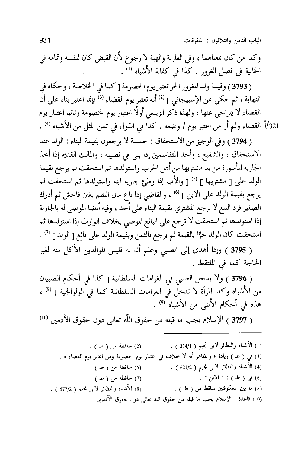 وكذا من كان بمعناهما وفي العارية والهبة لا رجوع لأن القبض كان لنفسه وتمامه في الخانية في فصل الغرور كذا في كفالة الأشباه وقيمة ولد المغرور الحر تعتبر يوم الخصومة وقيل تعتبر يوم القضاء والظاهر أنه لا خلاف في اعتبار يوم الخصومة ومن اعتبر يوم القضاء فإنما اعتبره بناء على أن القضاء لا يتراخى عنها ولهذا ذكر الزيلعي أولا اعتبار يوم الخصومة وثانيا اعتبار يوم القضاء ولم أر من اعتبر يوم وضعه كذا في القول في ثمن المثل. من الأشباه.وفي الوجيز من الاستحقاق خمسة لا يرجعون بقيمة البناء الولد عند الاستحقاق والشفيع وأحد المتقاسمين إذا بنى في نصيبه والمالك القديم إذا أخذ الجارية المأسورة من يد مشتريها من أهل الحرب واستولدها ثم استحقت لم يرجع بقيمة الولد على الابن والقاضي إذا باع مال اليتيم بغبن فاحش ثم أدرك الصغير فرد البيع لا يرجع المشتري بقيمة البناء على أحد وفيه أيضا الموصى له بالجارية إذا استولدها ثم استحقت كان الولد حرا بالقيمة ثم يرجع بالثمن وبقيمة الولد على البائع لا على الموصي وإذا أهدى إلى الصبي وعلم أنه له فليس للوالدين الأكل منه لغير الحاجة كما في الملتقط ولا يدخل الصبي والمرأة في الغرامات السلطانية كما في الولوالجية هذه في أحكام الأنثى. من الأشباه.الإسلام يجب ما قبله من حقوق الله تعالى دون حقون الآدميين