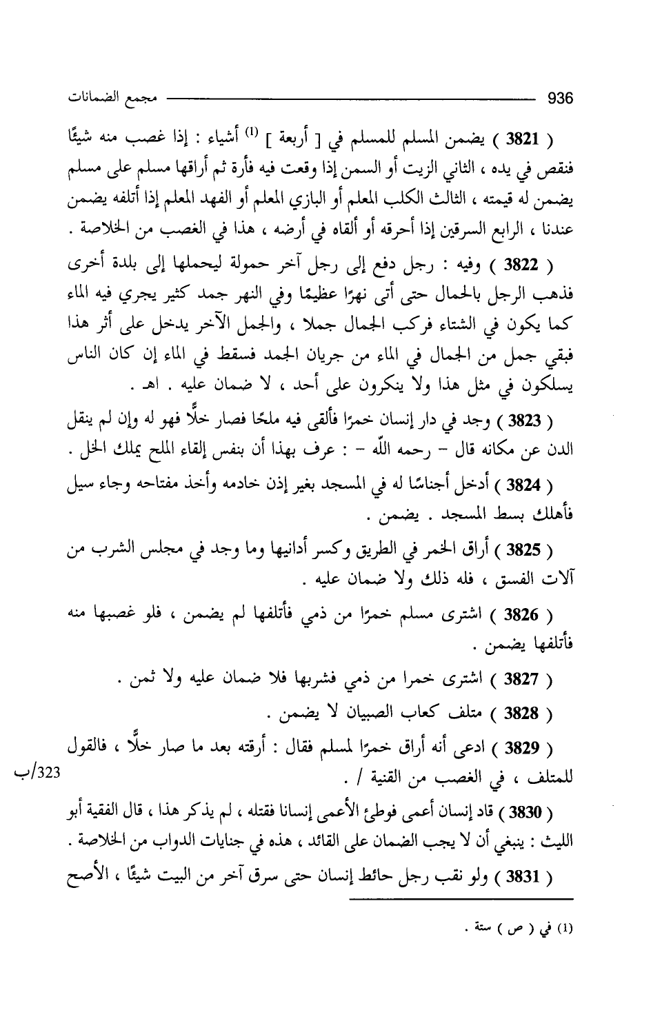 يضمن المسلم للمسلم في أربعة أشياء إذا غصب منه شيئا فنقص في يده الثاني الزيت أو السمن إذا وقعت فيه فأرة ثم أراقها مسلم على مسلم يضمن له قيمته الثالث الكلب المعلم أو البازي المعلم أو الفهد المعلم إذا أتلفه يضمن عندنا الرابع السرقين إذا أحرقه أو ألقاه في أرضه هذا في الغصب. من الخلاصة. وفيه رجل دفع إلى رجل آخر حمولة ليحملها إلى بلدة أخرى فذهب الرجل بالجمال حتى أتى نهرا عظيما وفي النهر جمد كثير يجري فيه الماء كما يكون في الشتاء فركب الجمال جملا والجمل الآخر يدخل على أثر هذا فبقي جمل من الجمال في الماء من جريان الجمل فسقط في الماء إن كان الناس يسلكون في مثل هذا ولا ينكرون على أحد لا ضمان عليه ا هـ وجد في دار إنسان خمرا فألقى فيه ملحا فصار خلا فهو له وإن لم ينقل الدن عن مكانه قال رحمه الله عرف بهذا أن بنفس إلقاء الملح يملك الخل أدخل أجناسا له في المسجد بغير إذن خادمه وأخذ مفتاحه وجاء سيل فأهلك بسط المسجد يضمن أراق الخمر في الطريق وكسر دنانها وما وجد في مجلس الشرب من آلات الفسق فله ذلك ولا ضمان عليه اشترى مسلم خمرا من ذمي فأتلفها فلم يضمن فلو غصبها منه فأتلفها يضمن اشترى خمرا من ذمي فشربها فلا ضمان عليه ولا ثمن متلف كعاب الصبيان لا يضمن ادعى أنه أراق خمر المسلم فقال أرقته بعدما صار خلا فالقول للمتلف في الغصب. من القنية. قاد إنسان أعمى فوطئ الأعمى إنسانا فقتله لم يذكر هذا قال الفقيه أبو الليث ينبغي أن لا يجب الضمان على القائد هذه في جنايات الدواب. من الخلاصة. ولو نقب رجل حائط إنسان حتى سرق آخر من البيت شيئا الأصح