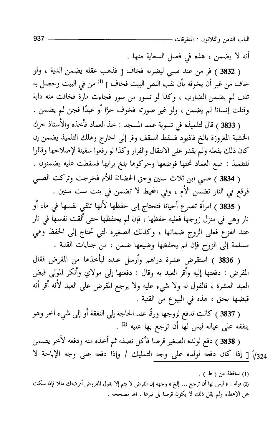 أنه لا يضمن هذه في فصل السعاية منها فر من عنده صبي ليضربه فخاف من في البيت وحصل به تلف لم يضمن الضارب وكذا لو تسور من سور فجاءت مارة فخافت منه دابة وقتلت إنسانا لم يضمن ولو غير صورته فخوف حرا أو عبدا فجن لم يضمن قال لتلميذه في تسوية عمد المسجد خذ العماد فأخذه والأستاذ حرك الخشبة المغروزة بالخ فأذيود فسقط السقف وفر إلى الخارج وهلك التلميذ يضمن إن كان ذلك بفعله ولم يقدر على الانتقال والفرار وكذا لو رفعوا سفينة لإصلاحها وقالوا للتلميذ ضع العماد تحتها وحركوها بلخ برابها فسقطت عليه يضمنون صبي ابن ثلاث سنين وحق الحضانة للأم فخرجت وتركت الصبي فوقع في النار تضمن الأم وفي المحيط لا تضمن في بنت ست سنين امرأة تصرع أحيانا فتحتاج إلى حفظها لأنها تلقي نفسها في ماء أو نار وهي في منزل زوجها فعليه حفظها فإن لم يحفظها حتى ألقت نفسها في نار عند الفزع فعلى الزوج ضمانها وكذلك الصغيرة التي تحتاج إلى الحفظ وهي مسلمة إلى الزوج فإن لم يحفظها وضيعها ضمن من جنايات القنية استقرض عشرة دراهم وأرسل عبده ليأخذها من المقرض فقال المقرض دفعتها إليه وأقر العبد به وقال دفعتها إلى مولاي وأنكر المولى قبض العبد العشرة فالقول له ولا شيء عليه ولا يرجع المقرض على العبد لأنه أقر أنه قبضها بحق هذه في البيوع. من القنية. كانت تدفع لزوجها ورقا عند الحاجة إلى النفقة أو إلى شيء آخر وهو ينفقه على عياله ليس لها أن ترجع بها عليه دفع لولده الصغير قرصا فأكل نصفه ثم أخذه منه ودفعه لآخر يضمن (إذا كان دفعه لولده على وجه التمليك / وإذا دفعه على وجه الإباحة لا