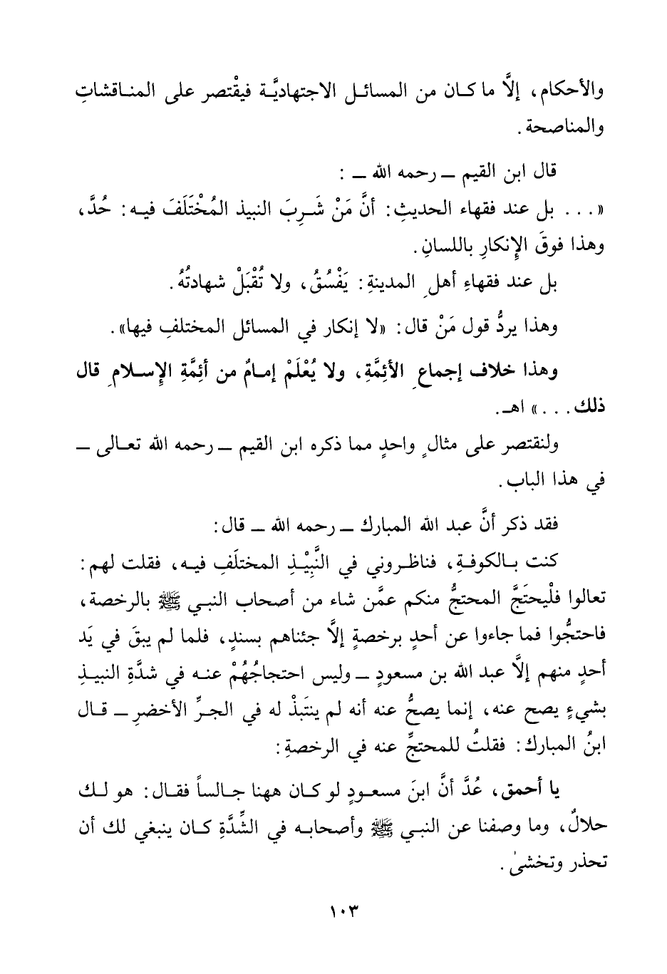 «... بل عند فقهاء الحديث: أنَّ مَنْ شَرِبَ النبيذ المُخْتَلَفَ فيه: حُدَّ، وهذا فوقَ الإنكار باللسانِ.
