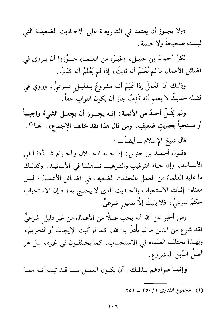 «قول أحمد بن حنبل: إذا جاء الحلال والحرام شدَّدنا فيِ الأسانيد، وإذا جاء الترغيب والترهيب تساهلنا في الأسانيد، وكذلك ما عليه العلماءُ من العمل بالحديث الضعيف في فضائل الأعمال؛ ليس معناه: إثبات الاستحباب بالحديث الذي لا يحتج به؛ فإن الاستحباب حكمٌ شرعي، فلا يثبتُ إلا بدليلٍ شرعي.