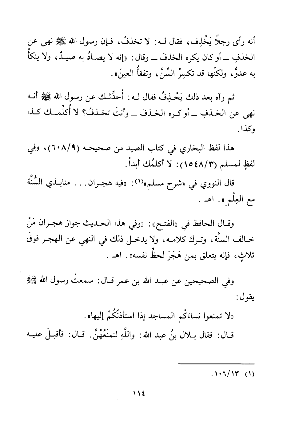 وقال الحافظ في «الفتح»: وفي هذا الحديث جواز هجران مَنْ خالف السنَّة، وترك كلامه، ولا يدخل ذلك في النهي عن الهجر فوقَ ثلاثٍ، فإنه يتعلق بمن هَجَرَ لحظِّ نفسه». اهـ.