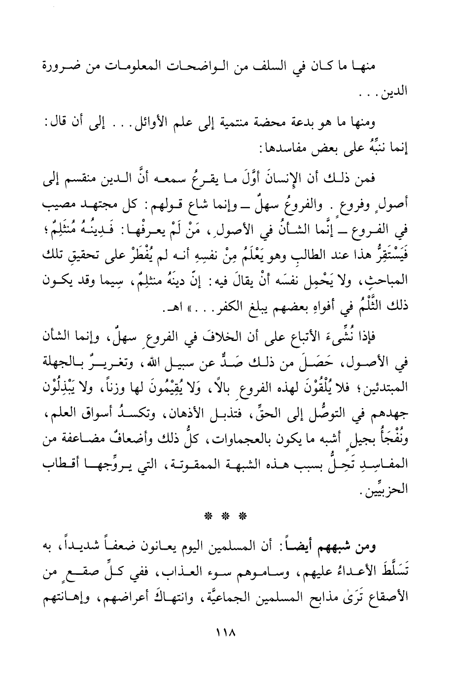 فمن ذلك أن الإنسانَ أوَّل ما يقرعُ سمعه أنَّ الدين منقسم إلى أصولٍ وفروعٍ، والفروعُ سهلٌ - وإنما شاع قولهم: كل مجتهد مصيب في الفروع - إنَّما الشأنُ في الأصولِ، مَنْ لَمْ يعرفْها: فَدِينُهُ مُنثَلِمٌ؛ فَيَسْتَقِرُّ هذا عند الطالبِ وهو يَعْلَمُ مِنْ نفسِهِ أنه لم يُفْطَرْ على تحقيقِ تلك المباحثِ، ولا يَحْمِل نفسَه أنْ يقالَ فيه: إنّ دينهُ منثلِمٌ، سِيما وقد يكون ذلك الثَّلْمُ في أفواهِ بعضهم يبلغ الكفر ...» اهـ.