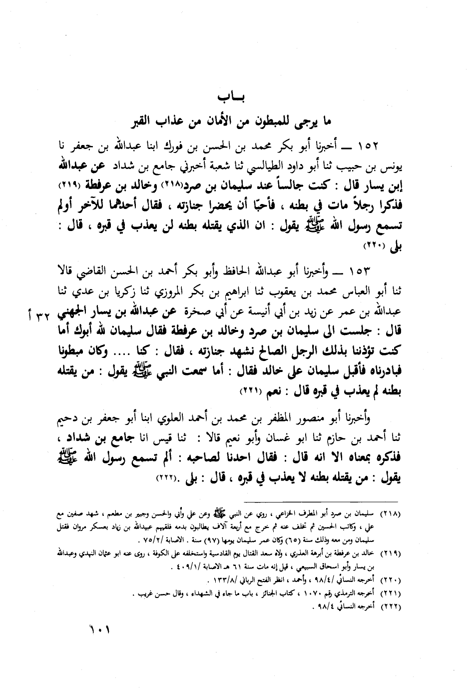 153 - وَأَخْبَرَنَا أَبُو عَبْدِ اللَّهِ الْحَافِظُ، وَأَبُو بَكْرٍ أَحْمَدُ بْنُ الْحَسَنِ الْقَاضِي قَالَا: ثَنَا أَبُو الْعَبَّاسِ مُحَمَّدُ بْنُ يَعْقُوبَ، ثَنَا إِبْرَاهِيمُ بْنُ بَكْرٍ الْمَرْوَزِيُّ، ثَنَا زَكَرِيَّا بْنُ عَدِيٍّ، ثَنَا عُبَيْدُ اللَّهِ بْنُ عَمْرُو، عَنْ زَيْدِ بْنِ أَبِي أُنَيْسَةَ، عَنْ أَبِي صَخْرَةَ، عَنْ عَبْدِ اللَّهِ بْنِ يَسَارٍ الْجُهَنِيِّ قَالَ: جَلَسْتُ إِلَى سُلَيْمَانَ بْنِ صُرَدٍ وَخَالِدِ بْنِ عُرْفُطَةَ، فَقَالَ سُلَيْمَانُ: لِلَّهِ أَبُوكَ، أَمَا كُنْتَ تُؤْذِنُنَا بِذَاكَ الرَّجُلِ الصَّالِحِ نَشْهَدُ جِنَازَتَهُ، فَقَالَ: كُنَّا مُحِسِّينَ وَكَانَ مَبْطُونًا فَبَادَرْنَاهُ فَأَقْبَلَ سُلَيْمَانُ عَلَى خَالِدٍ فَقَالَ: أَمَا سَمِعْتَ النَّبِيَّ صَلَّى اللهُ عَلَيْهِ وَسَلَّمَ يَقُولُ: «§مَنْ يَقْتُلُهُ بَطْنُهُ لَمْ يُعَذَّبْ فِي قَبْرِهِ» قَالَ: نَعَمْ وَأَخْبَرَنَا أَبُو مَنْصُورٍ الظَّفَرُ بْنُ مُحَمَّدِ بْنِ أَحْمَدَ الْعَلَوِيُّ، نَا أَبُو جَعْفَرِ بْنُ دُحَيْمٍ، ثَنَا أَحْمَدُ بْنُ حَازِمٍ، ثَنَا أَبُو غَسَّانَ، وَأَبُو نُعَيْمٍ قَالَا: ثَنَا قَيْسُ، أَنَا جَامِعُ بْنُ شَدَّادٍ، فَذَكَرَهُ بِمَعْنَاهُ إِلَّا أَنَّهُ قَالَ: فَقَالَ أَحَدُنَا لِصَاحِبِهِ: أَلَمْ تَسْمَعْ رَسُولَ اللَّهِ صَلَّى اللهُ عَلَيْهِ وَسَلَّمَ يَقُولُ: «مَنْ يَقْتُلُهُ بَطْنُهُ لَا يُعَذَّبُ فِي قَبْرِهِ» قَالَ: بَلَى