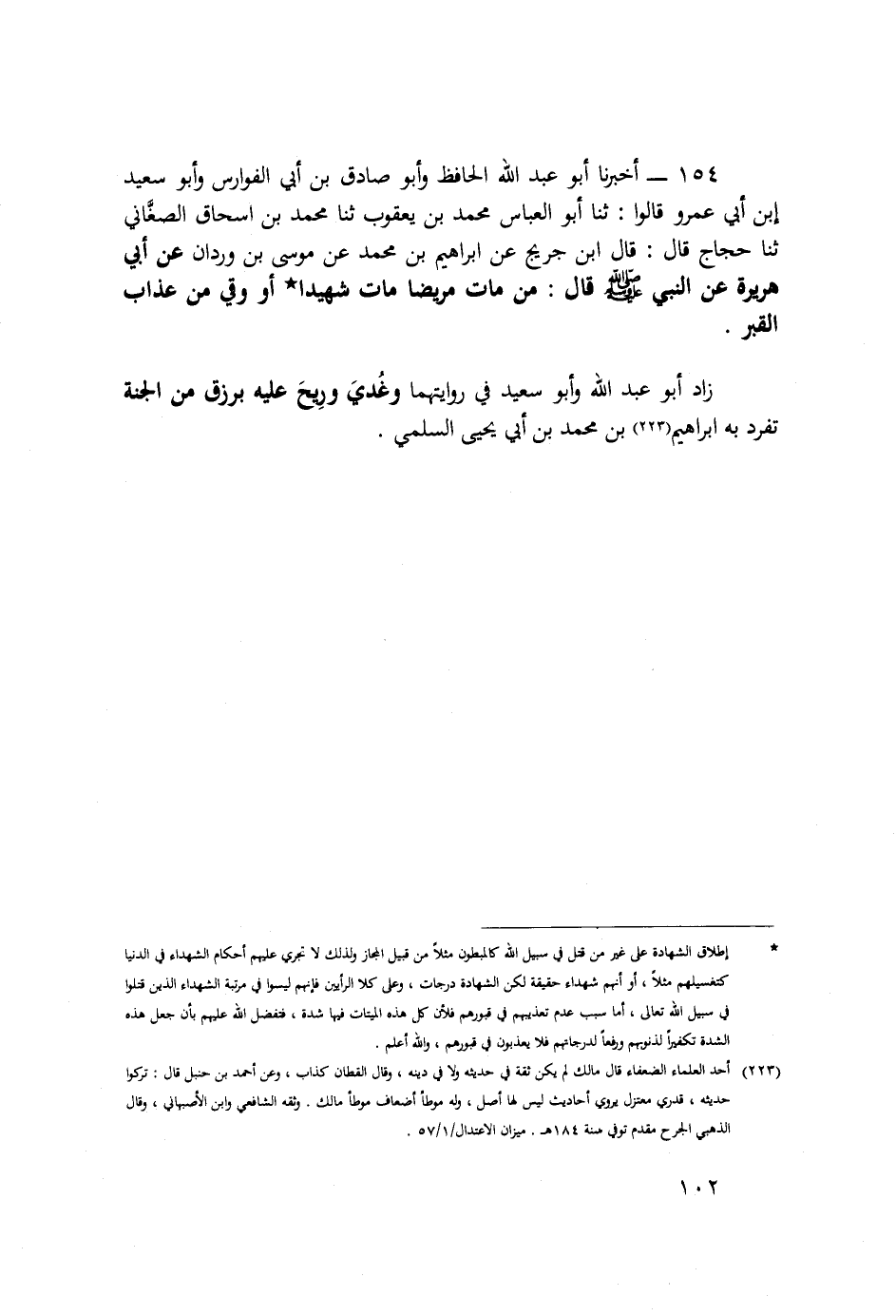 154 - أَخْبَرَنَا أَبُو عَبْدِ اللَّهِ الْحَافِظُ، وَأَبُو صَادِقِ بْنُ أَبِي الْفَوَارِسِ وَأَبُو سَعِيدِ بْنُ أَبِي عَمْرٍو قَالُوا: ثَنَا أَبُو الْعَبَّاسِ مُحَمَّدُ بْنُ يَعْقُوبَ، ثَنَا مُحَمَّدُ بْنُ إِسْحَاقَ الصَّغَانِيُّ، ثَنَا حَجَّاجٌ قَالَ: قَالَ ابْنُ جُرَيْجٍ: عَنْ إِبْرَاهِيمَ بْنِ مُحَمَّدٍ، عَنْ مُوسَى بْنِ وَرْدَانَ، عَنْ أَبِي هُرَيْرَةَ عَنِ النَّبِيِّ صَلَّى اللهُ عَلَيْهِ وَسَلَّمَ قَالَ: «§مَنْ مَاتَ مَرِيضًا مَاتَ شَهِيدًا، أَوْ وُقِيَ مِنْ عَذَابِ الْقَبْرِ» زَادَ أَبُو عَبْدِ اللَّهِ وَأَبُوسَعِيدٍ فِي رِوَايَتِهِمَا: «وَغُدِيَ وَرِيحَ عَلَيْهِ بِرِزْقٍ مِنَ الْجَنَّةِ» تَفَرَّدَ بِهِ إِبْرَاهِيمُ بْنُ مُحَمَّدِ بْنِ أَبِي يَحْيَى السُّلَمِيُّ