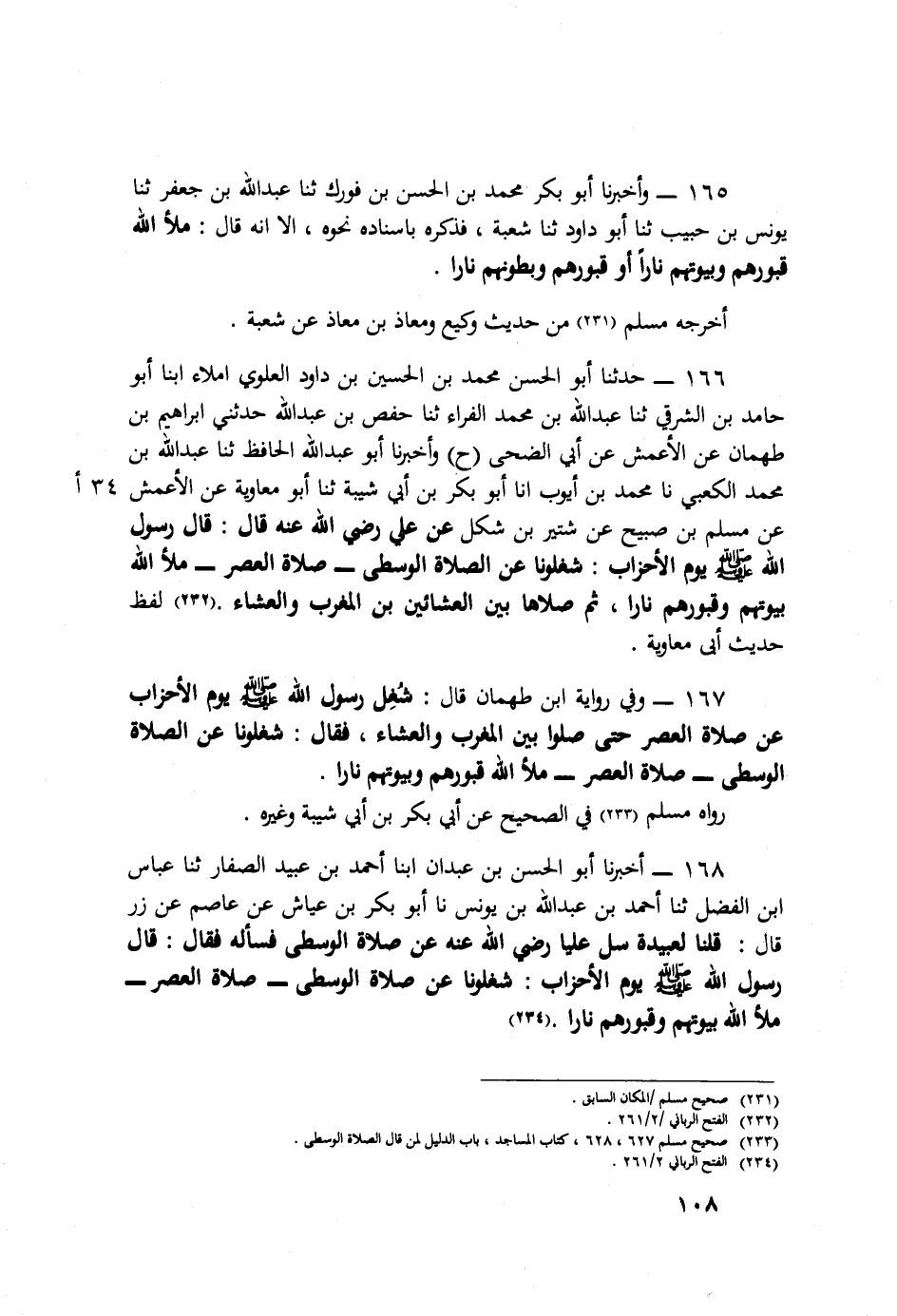 167 - وَفِي رِوَايَةِ ابْنِ طَهْمَانَ قَالَ: شُغِلَ رَسُولُ اللَّهِ صَلَّى اللهُ عَلَيْهِ وَسَلَّمَ يَوْمَ الْأَحْزَابِ عَنْ صَلَاةِ الْعَصْرِ حَتَّى صَلُّوا بَيْنَ الْمَغْرِبِ وَالْعِشَاءِ، فَقَالَ: «شَغَلُونَا عَنِ الصَّلَاةِ الْوُسْطَى، صَلَاةِ الْعَصْرِ، مَلَأَ اللَّهُ قُبُورَهُمْ وَبُيُوتَهُمْ نَارًا» رَوَاهُ مُسْلِمٌ فِي الصَّحِيحِ عَنْ أَبِي بَكْرِ بْنِ أَبِي شَيْبَةَ وَغَيْرِهِ