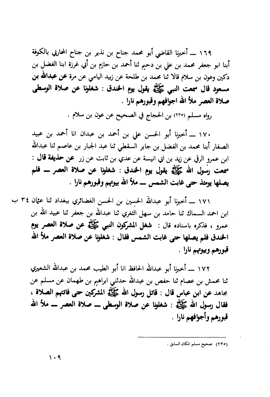 169 - أَخْبَرَنَا الْقَاضِي أَبُو مُحَمَّدٍ جُنَاحُ بْنُ نَذِيرِ بْنِ جُنَاحٍ الْمُحَارِبِيُّ بِالْكُوفَةِ، أَنْبَأَ أَبُو جَعْفَرٍ مُحَمَّدُ بْنُ عَلِيِّ بْنِ دُحَيْمٍ، ثَنَا أَحْمَدُ بْنُ حَازِمِ بْنِ أَبِي غَرَزَةَ، أنبا الْفَضْلُ بْنُ دُكَيْنٍ، وَعَوْنُ بْنُ سَلَّامٍ قَالَا: ثَنَا مُحَمَّدُ بْنُ طَلْحَةَ، عَنْ زُبَيْدٍ الْيَامِيِّ، عَنْ مُرَّةَ، عَنْ عَبْدِ اللَّهِ بْنِ مَسْعُودٍ قَالَ: سَمِعْتُ النَّبِيَّ صَلَّى اللهُ عَلَيْهِ وَسَلَّمَ يَقُولُ يَوْمَ الْخَنْدَقِ: «§شَغَلُونَا عَنْ صَلَاةِ الْوُسْطَى صَلَاةِ الْعَصْرِ، مَلَأَ اللَّهُ أَجْوَافَهُمْ وَقُبُورَهُمْ نَارًا» رَوَاهُ مُسْلِمُ بْنُ الْحَجَّاجِ فِي الصَّحِيحِ عَنْ عَوْنِ بْنِ سَلَّامٍ