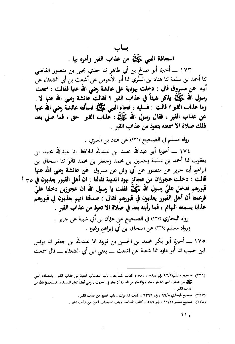 173 - أَخْبَرَنَا أَبُو صَالِحٍ بْنُ أَبِي طَاهِرٍ، ثَنَا جَدِّي يَحْيَى بْنُ مَنْصُورٍ الْقَاضِي، ثَنَا أَحْمَدُ بْنُ سَلَمَةَ، ثَنَا هَنَّادُ بْنُ السَّرِيِّ، ثَنَا أَبُو الْأَحْوَصِ، عَنْ أَشْعَثَ بْنِ أَبِي الشَّعْثَاءِ، عَنْ أَبِيهِ، عَنْ مَسْرُوقٍ قَالَ: دَخَلَتْ يَهُودِيَّةٌ عَلَى عَائِشَةَ رَضِيَ اللَّهُ عَنْهَا، فَقَالَتْ: سَمِعْتِ رَسُولَ اللَّهِ، صَلَّى اللهُ عَلَيْهِ وَسَلَّمَ، يَذْكُرُ شَيْئًا فِي عَذَابِ الْقَبْرِ، فَقَالَتْ عَائِشَةُ رَضِيَ اللهُ عَنْهَا: لَا، وَمَا عَذَابُ الْقَبْرِ؟ قَالَتْ: فَسَلِيهِ، فَجَاءَ النَّبِيُّ صَلَّى اللهُ عَلَيْهِ وَسَلَّمَ فَسَأَلَتْهُ عَائِشَةُ رَضِيَ اللهُ عَنْهَا عَنْ عَذَابِ الْقَبْرِ، فَقَالَ رَسُولُ اللَّهِ صَلَّى اللهُ عَلَيْهِ وَسَلَّمَ: §«عَذَابُ الْقَبْرِ حَقٌّ» فَمَا صَلَّى بَعْدَ ذَلِكَ صَلَاةً إِلَّا سَمِعْتُهُ يَتَعَوَّذُ مِنْ عَذَابِ الْقَبْرِ رَوَاهُ مُسْلِمٌ فِي الصَّحِيحِ عَنْ هَنَّادِ بْنِ السَّرِيِّ