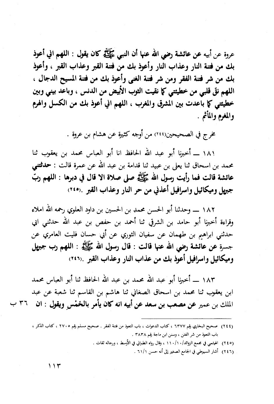 182 - وَحَدَّثَنَا أَبُو الْحَسَنِ مُحَمَّدُ بْنُ الْحُسَيْنِ بْنِ دَاوُدَ الْعَلَوِيُّ رَحِمَهُ اللَّهُ، إِمْلَاءً وَقِرَاءَةً، أَخْبَرَنَا أَبُو حَامِدِ بْنُ الشَّرْقِيِّ، ثَنَا أَحْمَدُ بْنُ حَفْصِ بْنِ عَبْدِ اللَّهِ، حَدَّثَنِي أَبِي، حَدَّثَنِي إِبْرَاهِيمُ بْنُ طَهْمَانَ، عَنْ سُفْيَانَ الثَّوْرِيِّ، عَنْ أَبِي حَسَّانَ فُلَيْتٍ الْعَامِرِيِّ، عَنْ جَسْرَةَ، عَنْ عَائِشَةَ رَضِيَ اللَّهُ عَنْهَا قَالَتْ: قَالَ رَسُولُ اللَّهِ صَلَّى اللهُ عَلَيْهِ وَسَلَّمَ: «اللَّهُمَّ رَبَّ جِبْرِيلَ وَمِيكَائِيلَ وَإِسْرَافِيلَ , §أَعُوذُ بِكَ مِنْ عَذَابِ النَّارِ وَعَذَابِ الْقَبْرِ»