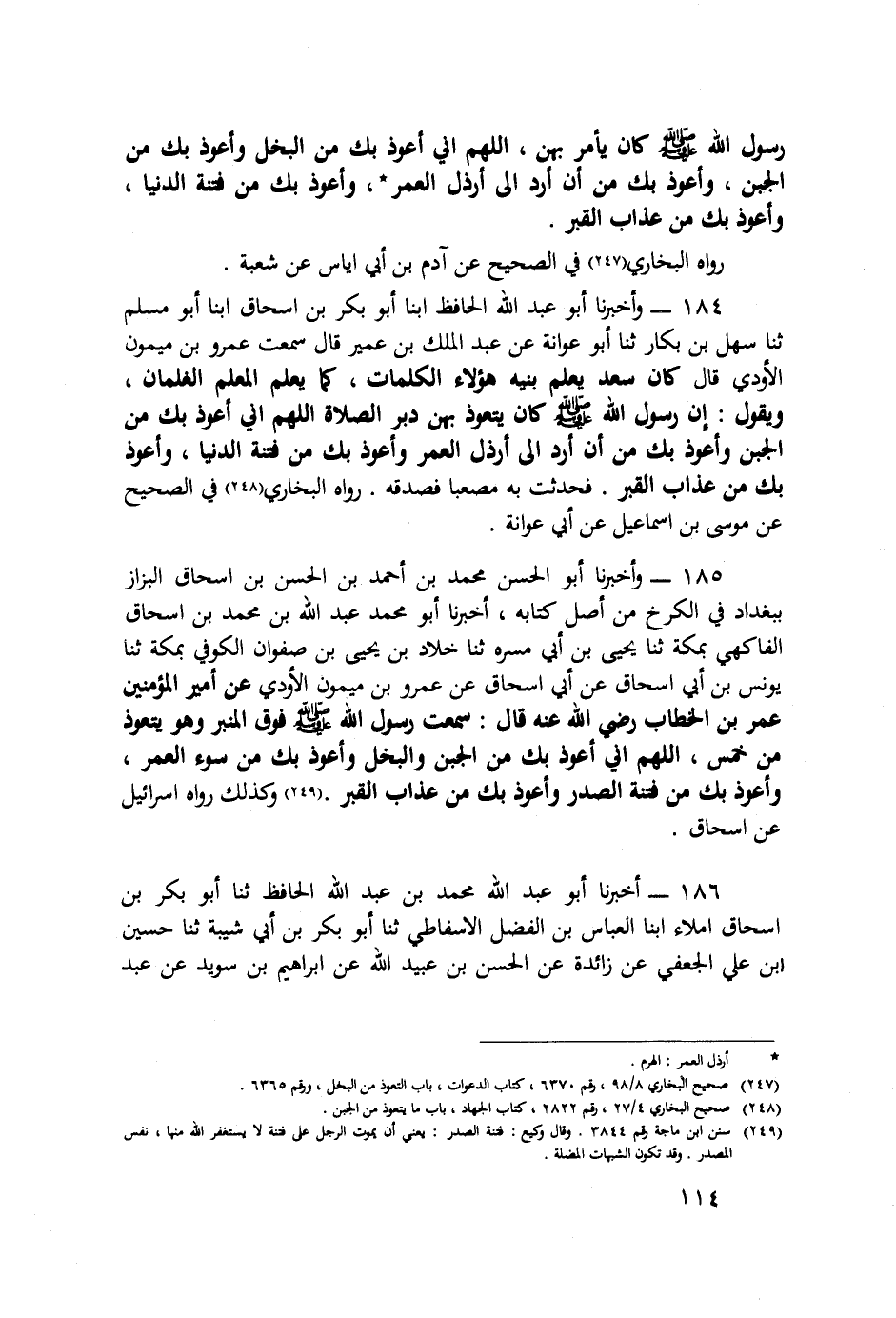184 - وَأَخْبَرَنَا أَبُو عَبْدِ اللَّهِ الْحَافِظُ، أنبا أَبُو بَكْرِ بْنُ إِسْحَاقَ، أنبا أَبُو مُسْلِمٍ، ثَنَا سَهْلُ بْنُ بَكَّارٍ، ثَنَا أَبُو عَوَانَةَ، عَنْ عَبْدِ الْمَلِكِ بْنِ عُمَيْرٍ قَالَ: سَمِعْتُ عَمْرَو بْنَ مَيْمُونٍ الْأَوْدِيَّ قَالَ: كَانَ سَعْدٌ يُعَلِّمُ بَنِيهِ هَؤُلَاءِ الْكَلِمَاتِ كَمَا يُعَلِّمُ الْمُعَلِّمُ الْغِلْمَانَ، وَيَقُولُ: إِنَّ رَسُولَ اللَّهِ صَلَّى اللهُ عَلَيْهِ وَسَلَّمَ كَانَ يَتَعَوَّذُ بِهِنَّ دُبُرَ الصَّلَاةِ: «اللَّهُمَّ إِنِّي §أَعُوذُ بِكَ مِنَ الْجُبْنِ، وَأَعُوذُ بِكَ مِنْ أَنْ أَرُدَّ إِلَى أَرْذَلِ الْعُمُرِ، وَأَعُوذُ بِكَ مِنْ فِتْنَةِ الدُّنْيَا، وَأَعُوذُ بِكَ مِنْ عَذَابِ الْقَبْرِ» فَحَدَّثْتُ بِهِ مُصْعَبًا فَصَدَّقَهُ رَوَاهُ الْبُخَارِيُّ فِي الصَّحِيحِ عَنْ مُوسَى بْنِ إِسْمَاعِيلَ عَنْ أَبِي عَوَانَةَ