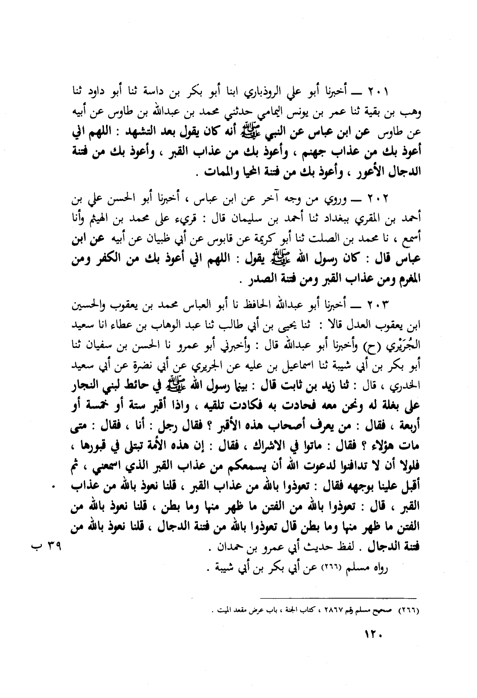 201 - أَخْبَرَنَا أَبُو عَلِيٍّ الرُّوذْبَارِيُّ، أنبا أَبُو بَكْرِ بْنُ دَاسَةَ، ثَنَا أَبُو دَاوُدَ، ثَنَا وَهْبُ بْنُ بَقِيَّةَ، ثَنَا عُمَرُ بْنُ يُونُسَ الْيَمَامِيُّ، حَدَّثَنِي مُحَمَّدُ بْنُ عَبْدِ اللَّهِ بْنِ طَاوُسٍ، عَنْ أَبِيهِ، عَنْ طَاوُسٍ، عَنِ ابْنِ عَبَّاسٍ عَنِ النَّبِيِّ صَلَّى اللهُ عَلَيْهِ وَسَلَّمَ أَنَّهُ كَانَ يَقُولُ بَعْدَ التَّشَهُّدِ: «اللَّهُمَّ إِنِّي §أَعُوذُ بِكَ مِنْ عَذَابِ جَهَنَّمَ، وَأَعُوذُ بِكَ مِنْ عَذَابِ الْقَبْرِ، وَأَعُوذُ بِكَ مِنْ فِتْنَةِ الدَّجَّالِ الْأَعْوَرِ، وَأَعُوذُ بِكَ مِنْ فِتْنَةِ الْمَحْيَا وَالْمَمَاتِ»