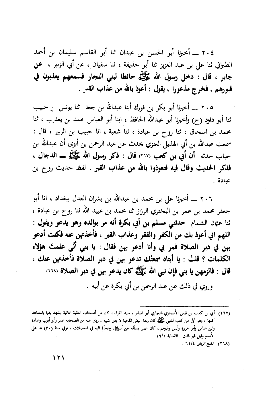 204 - أَخْبَرَنَا أَبُو الْحَسَنِ بْنُ عَبْدَانَ، ثَنَا أَبُو الْقَاسِمِ سُلَيْمَانُ بْنُ أَحْمَدَ الطَّبَرَانِيُّ، ثَنَا عَلِيُّ بْنُ عَبْدِ الْعَزِيزِ، ثَنَا أَبُو حُذَيْفَةَ، ثَنَا سُفْيَانُ، عَنْ أَبِي الزُّبَيْرِ، عَنْ جَابِرٍ قَالَ: دَخَلَ رَسُولُ اللَّهِ صَلَّى اللهُ عَلَيْهِ وَسَلَّمَ حَائِطًا لِبَنِي النَّجَّارِ فَسَمِعَهُمْ يُعَذَّبُونَ فِي قُبُورِهِمْ، فَخَرَجَ مَذْعُورًا يَقُولُ: §«أَعُوذُ بِاللَّهِ مِنْ عَذَابِ الْقَبْرِ»