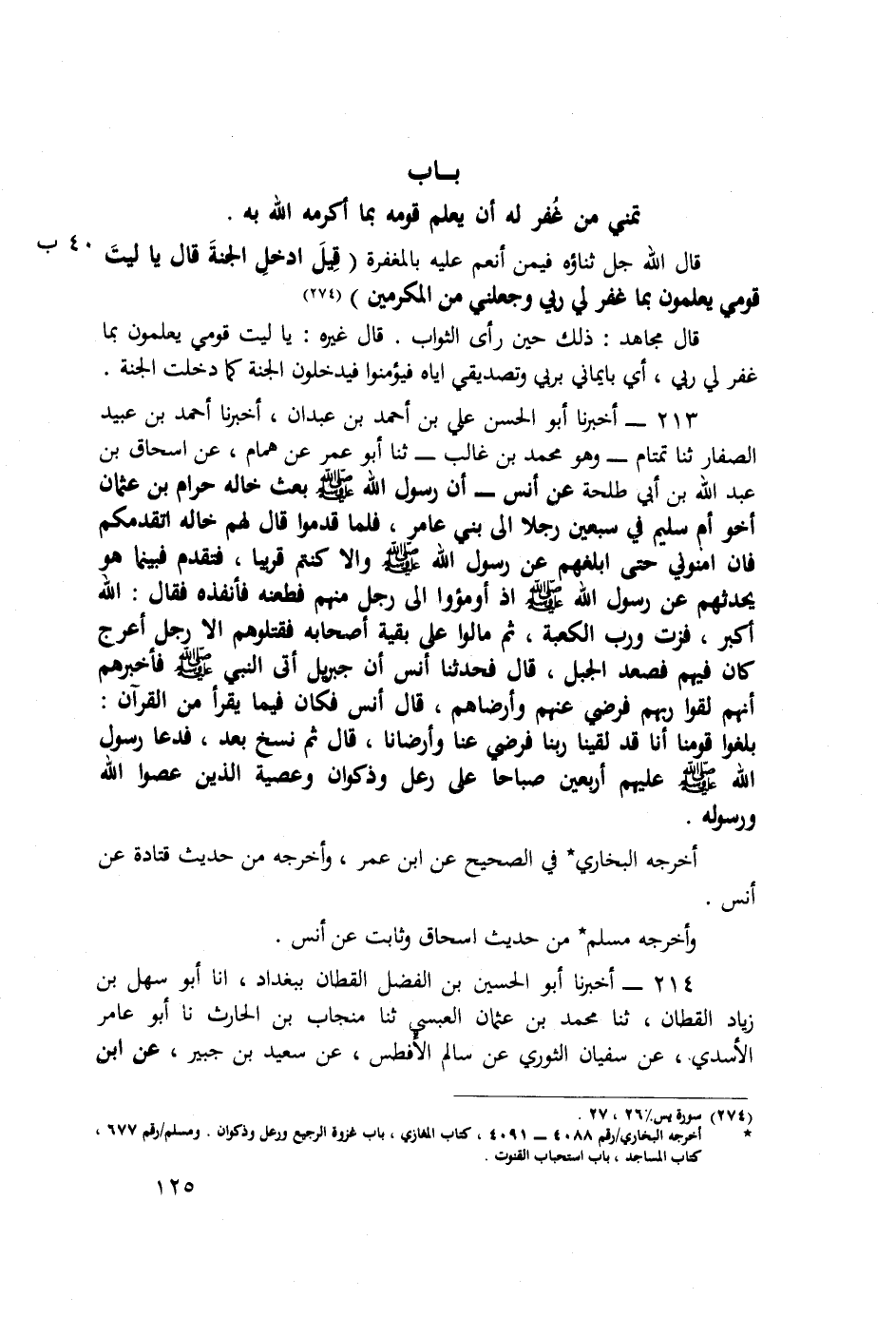213 - أَخْبَرَنَا أَبُو الْحَسَنِ عَلِيُّ بْنُ أَحْمَدَ بْنِ عَبْدَانَ، أَخْبَرَنَا أَحْمَدُ بْنُ عُبَيْدٍ الصَّفَّارُ، ثَنَا تَمْتَامٌ وَهُوَ مُحَمَّدُ بْنُ غَالِبٍ، ثَنَا أَبُو عُمَرَ، عَنْ هَمَّامٍ، عَنْ إِسْحَاقَ بْنِ عَبْدِ اللَّهِ بْنِ أَبِي طَلْحَةَ، عَنْ أَنَسٍ أَنَّ رَسُولَ اللَّهِ صَلَّى اللهُ عَلَيْهِ وَسَلَّمَ بَعَثَ خَالَهُ حَرَامَ بْنَ عُثْمَانَ أَخَا أُمِّ سُلَيْمٍ فِي سَبْعِينَ رَجُلًا إِلَى بَنِي عَامِرٍ فَلَمَّا قَدِمُوا قَالَ لَهُمْ خَالُهُ: أَتَقَدَّمُكُمْ فَإِنْ أَمَّنُونِي حَتَّى أُبَلِّغَهُمْ عَنْ رَسُولِ اللَّهِ صَلَّى اللهُ عَلَيْهِ وَسَلَّمَ، وَإِلَّا كُنْتُمْ قَرِيبًا، فَتَقَدَّمَ فَبَيْنَمَا هُوَ يُحَدِّثُهُمْ عَنْ رَسُولِ اللَّهِ صَلَّى اللَّهُ عَلَيْهِ وَسَلَّمَ إِذْ أَوْمَؤُوا إِلَى رَجُلٍ مِنْهُمْ فَطَعَنَهُ فَأَنْفَذَهُ، فَقَالَ: اللَّهُ أَكْبَرُ، فُزْتُ وَرَبِّ الْكَعْبَةِ، ثُمَّ مَالُوا عَلَى بَقِيَّةِ أَصْحَابِهِ فَقَتَلُوهُمْ، إِلَّا رَجُلٌ أَعْرَجُ كَانَ فِيهِمْ، فَصَعِدَ الْجَبَلَ قَالَ: فَحَدَّثَنَا أَنَسٌ " أَنَّ §جِبْرِيلَ أَتَى النَّبِيَّ صَلَّى اللَّهُ عَلَيْهِ وَسَلَّم فَأَخْبَرْهُ أَنَّهُمْ لَقُوا رَبَّهَمْ فَرَضِيَ عَنْهُمْ وَأَرْضَاهُمْ قَالَ أَنَسٌ: فَكَانَ فِيمَا يُقْرَأُ مِنَ الْقُرْآنِ «بَلِّغُوا قَوْمَنَا أَنَّا قَدْ لَقِينَا رَبَّنَا فَرَضِيَ عَنَّا وَأَرْضَانَا» قَالَ: ثُمَّ نُسِخَ بَعْدُ، فَدَعَا رَسُولُ اللَّهِ صَلَّى اللهُ عَلَيْهِ وَسَلَّمَ عَلَيْهِمْ أَرْبَعِينَ صَبَاحًا عَلَى رِعْلٍ وَذَكْوَانَ وَعُصَيَّةَ الَّذِينَ عَصَوُا اللَّهَ وَرَسُولَهُ " أَخْرَجَهُ الْبُخَارِيُّ فِي الصَّحِيحِ عَنِ أَبِي عُمَرَ، وَأَخْرَجَهُ مِنْ حَدِيثِ قَتَادَةَ عَنْ أَنَسٍ، وَأَخْرَجَهُ مُسْلِمٌ مِنْ حَدِيثِ إِسْحَاقَ وَثَابِتٍ عَنْ أَنَسٍ
