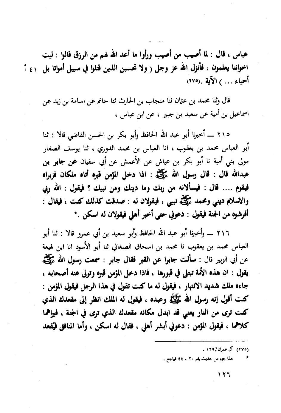 215 - أَخْبَرَنَا أَبُو عَبْدِ اللَّهِ الْحَافِظُ، وَأَبُو بَكْرِ بْنُ الْحَسَنِ الْقَاضِي قَالَا: ثَنَا أَبُو الْعَبَّاسِ مُحَمَّدُ بْنُ يَعْقُوبَ، أَنَبَا الْعَبَّاسُ بْنُ مُحَمَّدٍ الدُّورِيُّ، ثَنَا يُوسُفُ الصَّفَّارُ مَوْلَى بَنِي أُمَيَّةَ، نَا أَبُو بَكْرِ بْنُ عَيَّاشٍ، عَنِ الْأَعْمَشِ، عَنْ أَبِي سُفْيَانَ، عَنْ جَابِرِ بْنِ عَبْدِ اللَّهِ قَالَ: قَالَ رَسُولُ اللَّهِ صَلَّى اللهُ عَلَيْهِ وَسَلَّمَ: §" إِذَا دَخَلَ الْمُؤْمِنُ قَبْرَهُ أَتَاهُ مَلَكَانِ فَزَبَرَاهُ فَيَقُومُ يَهَابُ الْفَتَّانَ. قَالَ: فَيَسْأَلَانِهِ مَنْ رَبُّكَ وَمَا دِينُكَ وَمَنْ نَبِيُّكَ؟ فَيَقُولُ: اللَّهُ رَبِّي وَالْإِسْلَامُ دِينِي وَمُحَمَّدٌ صَلَّى اللَّهُ عَلَيْهِ وَسَلَّم نَبِيِّي، فَيَقُولَانِ لَهُ: صَدَقْتَ، كَذَلِكَ كُنْتَ، فَيُقَالُ: افْرُشُوهُ مِنَ الْجَنَّةِ، وَاكْسُوهُ مِنَ الْجَنَّةِ. فَيَقُولُ: دَعُونِي حَتَّى أُخْبِرَ أَهْلِي، فَيَقُولَانِ لَهُ: اسْكُنْ "