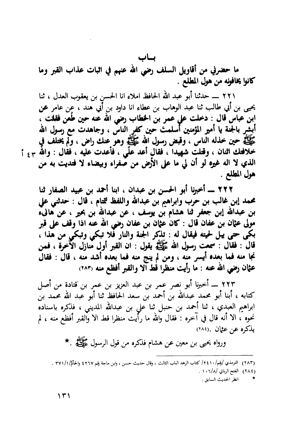 223 - أَخْبَرَنَاهُ أَبُو نَصْرٍ عُمَرُ بْنُ الْعَزِيزِ بْنِ عُمَرَ، عْنِ قَتَادَةَ مِنْ أَصْلِ كِتَابِهِ، أنبََا أَبُو مُحَمَّدٍ عَبْدُ اللَّهِ بْنُ أَحْمَدَ بْنِ سَعِيدٍ الْحَافِظُ، ثَنَا أَبُو عَبْدِ اللَّهِ مُحَمَّدُ بْنُ إِبْرَاهِيمَ الْعَبْدِيُّ، ثَنَا أَحْمَدُ بْنُ حَنْبَلٍ، ثَنَا عَلِيُّ بْنُ عَبْدِ اللَّهِ الْمَدِينِيُّ، فَذَكَرَهُ بِإِسْنَادِهِ نَحْوَهُ إِلَّا أَنَّهُ قَالَ فِي آخِرِهِ فَقَالَ: وَاللَّهِ مَا رَأَيْتُ مَنْظَرًا قَطُّ إِلَّا وَالْقَبْرُ أَفْظَعُ مِنْهُ "، لَمْ يَذْكُرْهُ عَنْ عُثْمَانَ، وَرَوَاهُ يَحْيَى بْنُ مَعِينٍ عَنْ هِشَامٍ، فَذَكَرَهُ فِي قَوْلِ الرَّسُوْلِ صَلَّى اللهُ عَلَيْهِ وَسَلَّمَ