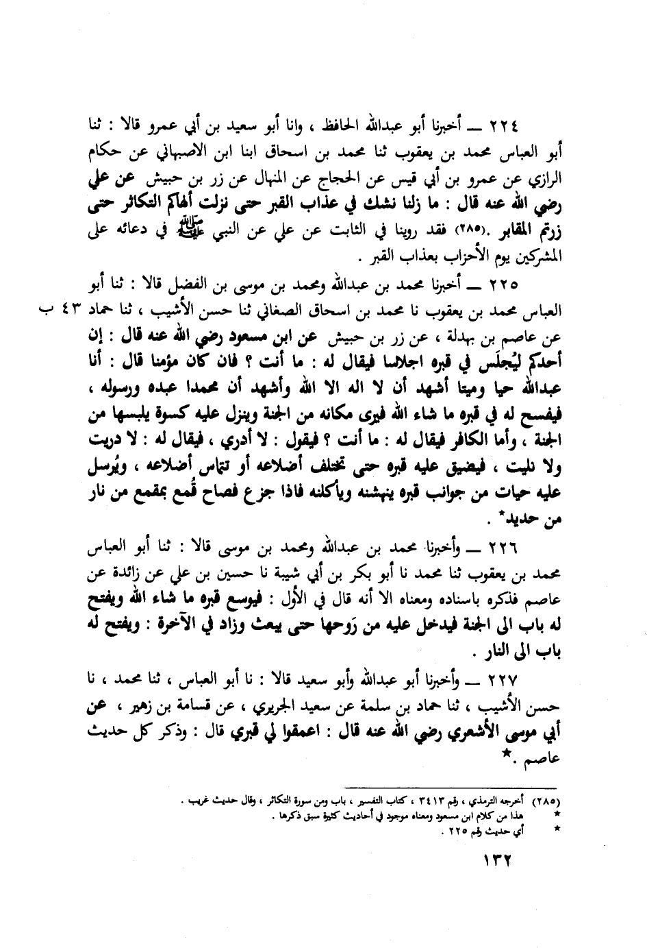 224 - أَخْبَرَنَا أَبُو عَبْدِ اللَّهِ الْحَافِظُ، أَنَا أَبُو سَعِيدِ بْنُ أَبِي عَمْرٍو قَالَ: ثَنَا أَبُو الْعَبَّاسِ مُحَمَّدُ بْنُ يَعْقُوبَ، ثَنَا مُحَمَّدُ بْنُ إِسْحَاقَ، أنَبَا ابْنُ الْأَصْبَهَانِيِّ، عَنْ حَكَّامٍ الرَّازِيِّ، عَنْ عَمْرِو بْنِ أَبِي قَيْسٍ، عَنِ الْحَجَّاجِ عَنِ الْمِنْهَالِ، عَنْ ذِرِّ بْنِ حُبَيْشٍ، عَنْ عَلِيٍّ رَضِيَ اللَّهُ عَنْهُ قَالَ: §«مَا زِلْنَا نَشُكُّ فِي عَذَابِ الْقَبْرِ حَتَّى نَزَلَتْ أَلْهَاكُمُ التَّكَاثُرُ حَتَّى زُرْتُمُ الْمَقَابِرَ» فَقَدْ رُوِّينَا فِي الثَّابِتِ عَنْ عَلِيٍّ عَنِ النَّبِيِّ صَلَّى اللهُ عَلَيْهِ وَسَلَّمَ فِي دُعَائِهِ عَلَى الْمُشْرِكِينَ يَوْمَ الْأَحْزَابِ بِعَذَابِ الْقَبْرِ