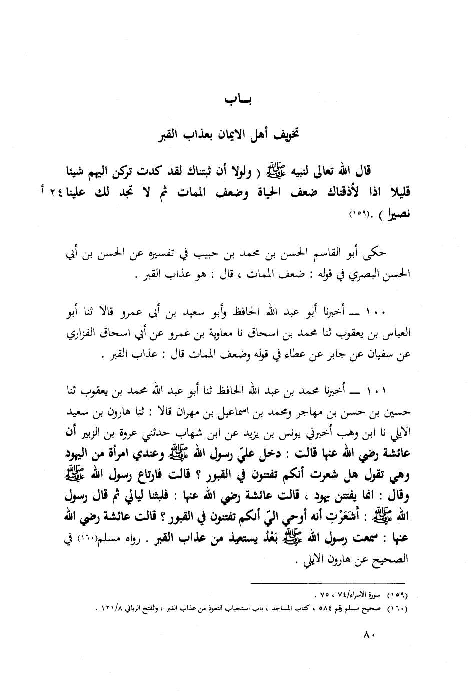 §بَابُ تَخْوِيفِ أَهْلِ الْإِيْمَانِ بِعَذَابِ الْقَبْرِ قَالَ اللَّهُ تَعَالَى لِنَبِيِّهِ صَلَّى اللهُ عَلَيْهِ وَسَلَّم {وَلَوْلَا أَنْ ثَبَّتْنَاكَ لَقَدْ كِدْتَ تَرَكْنُ إِلَيْهِمْ شَيْئًا قَلِيلًا، إِذًا لَأَذَقْنَاكَ ضِعْفَ الْحَيَاةِ وَضِعْفَ الْمَمَاتِ ثُمَّ لَا تَجِدُ لَكَ عَلَيْنَا نَصِيرًا} [الإسراء: 75] حَكَى أَبُو الْقَاسِمِ الْحَسَنُ بْنُ مُحَمَّدِ بْنِ حَبِيبٍ فِي تَفْسِيرِهِ عَنِ الْحَسَنِ بْنِ أَبِي الْحَسَنِ الْبَصْرِيِّ فِي قَوْلِهِ {ضِعْفَ الْمَمَاتِ} [الإسراء: 75] قَالَ: هُوَ عَذَابُ الْقَبْرِ