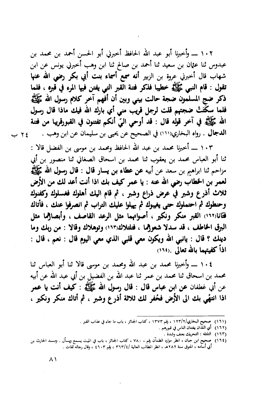 102 - وَأَخْبَرَنَا أَبُو عَبْدِ اللَّهِ الْحَافِظُ، أَخْبَرَنِي أَبُو الْحَسَنِ أَحْمَدُ بْنُ مُحَمَّدِ بْنِ عَبْدُوسٍ، ثَنَا عُثْمَانُ بْنُ سَعِيدٍ، ثَنَا أَحْمَدُ بْنُ صَالِحٍ، ثَنَا ابْنُ وَهْبٍ، أَخْبَرَنِي يُونُسُ، عَنِ ابْنِ شِهَابٍ قَالَ: أَخْبَرَنِي عُرْوَةُ بْنُ الزُّبَيْرِ، أَنَّهُ سَمِعَ أَسْمَاءَ بِنْتَ أَبِي بَكْرٍ رَضِيَ اللَّهُ عَنْهَا تَقُولُ: قَامَ النَّبِيُّ صَلَّى اللهُ عَلَيْهِ وَسَلَّمَ خَطِيبًا، فَذَكَرَ فِتْنَةَ الْقَبْرِ الَّتِي يُفْتَنُ فِيهَا الْمَرْءُ فِي قَبْرِهِ، فَلَمَّا ذَكَرَ ذَلِكَ ضَجَّ الْمُسْلِمُونَ ضَجَّةً حَالَتْ بَيْنِي وَبَيْنَ أَنْ أَفْهَمَ آخِرَ كَلَامِ رَسُولِ اللَّهِ صَلَّى اللهُ عَلَيْهِ وَسَلَّمَ، فَلَمَّا سَكَنَتْ ضَجَّتُهُمْ قُلْتُ لِرَجُلٍ قَرِيبٍ مِنِّي: أَيْ بَارَكَ اللَّهُ فِيكَ، مَاذَا قَالَ رَسُولُ اللَّهِ صَلَّى اللهُ عَلَيْهِ وَسَلَّمَ فِي آخِرِ قَوْلِهِ؟ قَالَ: «قَدْ §أُوحِيَ إِلَيَّ أَنَّكُمْ تُفْتَنُونَ فِي الْقُبُورِ قَرِيبًا مِنْ فِتْنَةِ الدَّجَّالِ» رَوَاهُ الْبُخَارِيُّ فِي الصَّحِيحِ عَنْ يَحْيَى بْنِ سُلَيْمَانَ عَنِ ابْنِ وَهْبٍ