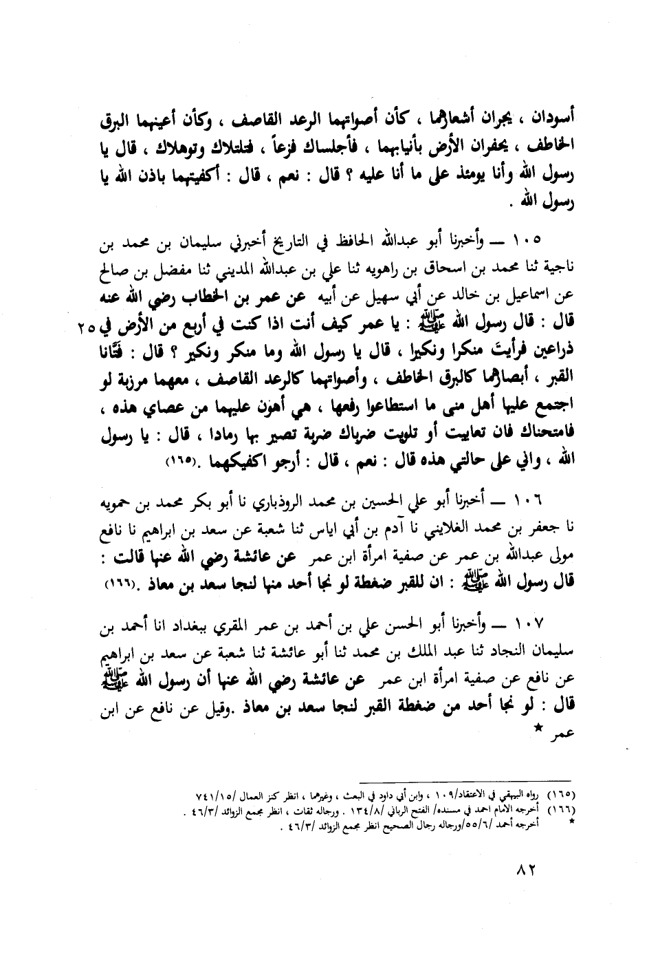 105 - وَأَخْبَرَنَا أَبُو عَبْدِ اللَّهِ الْحَافِظُ، فِي التَّارِيخِ، أَخْبَرَنِي سُلَيْمَانُ بْنُ مُحَمَّدِ بْنِ نَاجِيَةَ، ثَنَا مُحَمَّدُ بْنُ إِسْحَاقَ بْنِ رَاهَوَيْهِ، ثَنَا عَلِيُّ بْنُ عَبْدِ اللَّهِ الْمَدِينِيُّ، ثَنَا مُفَضَّلُ بْنُ صَالِحٍ، عَنْ إِسْمَاعِيلَ بْنِ أَبِي خَالِدٍ، عَنْ أَبِي سُهَيْلٍ، عَنْ أَبِيهِ، عَنْ عُمَرَ بْنِ الْخَطَّابِ رَضِيَ اللَّهُ عَنْهُ قَالَ: قَالَ رَسُولُ اللَّهِ صَلَّى اللهُ عَلَيْهِ وَسَلَّم: «يَا عُمَرُ §كَيْفَ أَنْتَ إِذَا كُنْتَ فِي أَرْبَعٍ مِنَ الْأَرْضِ فِي ذِرَاعَيْنِ، فَرَأَيْتَ مُنْكَرًا وَنَكِيرًا؟» قَالَ: يَا رَسُولَ اللَّهِ وَمَا مُنْكَرٌ وَنَكِيرٌ؟ قَالَ: «فَتَّانَا الْقَبْرِ أَبْصَارُهُمَا كَالْبَرْقِ الْخَاطِفِ وَأَصْوَاتُهُمَا كَالرَّعْدِ الْقَاصِفِ، مَعَهُمَا مِرْزَبَّةٌ لَوِ اجْتَمَعَ عَلَيْهَا أَهْلُ مِنًى مَا اسْتَطَاعُوا رَفْعَهَا، هِيَ أَهْوَنُ عَلَيْهَمَا مِنْ عَصَايَ هَذِهِ، فَامْتَحَنَاكَ، فَإِنْ تَعَايَيْتَ أَوْ تَلَوَّيْتَ ضَرَبَاكَ بِهَا ضَرْبَةً تَصِيرُ بِهَا رَمَادًا» قَالَ: يَا رَسُولَ اللَّهِ، وَإِنِّي عَلَى حَالَتِي هَذِهِ؟ قَالَ: «نَعَمْ» قَالَ: أَرْجُو أَكْفِيكَهُمَا
