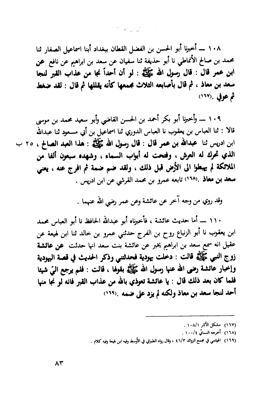 109 - وَأَخْبَرَنَا أَبُو بَكْرٍ أَحْمَدُ بْنُ الْحَسَنِ الْقَاضِي وَأَبُو سَعِيدٍ مُحَمَّدُ بْنُ مُوسَى قَالَا: ثَنَا الْعَبَّاسُ بْنُ يَعْقُوبَ، نَا الْعَبَّاسُ الدُّورِيُّ، ثَنَا إِسْمَاعِيلُ بْنُ أَبِي مَسْعُودٍ، ثَنَا عَبْدُ اللَّهِ بْنُ إِدْرِيسَ عَنْ عُبَيْدِ اللهِ عَن نَّافِعٍ، ثَنَا عَبْدُ اللَّهِ بْنُ عُمَرَ قَالَ: قَالَ رَسُولُ اللَّهِ صَلَّى اللهُ عَلَيْهِ وَسَلَّمَ: «§هَذَا الْعَبْدُ الصَّالِحُ الَّذِي تَحَرَّكَ لَهُ الْعَرْشُ، وَفُتِحَتْ لَهُ أَبْوَابُ السَّمَاءِ، وَشَهِدَهُ سَبْعُونَ أَلْفًا مِنَ الْمَلَائِكَةَ لَمْ يَهْبِطُوا إِلَى الْأَرْضِ قَبْلَ ذَلِكَ، وَلَقَدْ ضُمَّ ضَمَّةً ثُمَّ أُفْرِجُ عَنْهُ» يَعْنِي سَعْدَ بْنَ مُعَاذٍ تَابَعَهُ عَمْرُو بْنُ مُحَمَّدٍ الْقُرَشِيُّ، عَنِ ابْنِ إِدْرِيسَ وَقَدْ رُوِيَ مِنْ وَجْهٍ آخَرَ عَنْ عَائِشَةَ، وَعَنِ عُمَرَ رَضِيَ اللَّهُ عَنْهُمَا