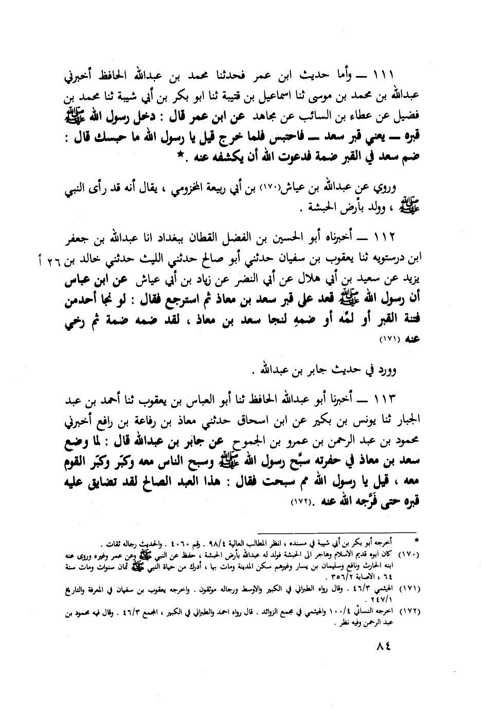 111 - وَأَمَّا حَدِيثُ ابْنِ عُمَرَ فَحَدَّثَنَا مُحَمَّدُ بْنُ عَبْدِ اللَّهِ الْحَافِظُ، أَخْبَرَنِي عَبْدُ اللَّهِ بْنُ مُحَمَّدِ بْنِ مُوسَى، ثَنَا إِسْمَاعِيلُ بْنُ قُتَيْبَةَ، ثَنَا أَبُو بَكْرِ بْنُ أَبِي شَيْبَةَ، ثَنَا مُحَمَّدُ بْنُ فُضَيْلٍ، عَنْ عَطَاءِ بْنِ السَّائِبِ، عَنْ مُجَاهِدٍ، عَنِ ابْنِ عُمَرَ قَالَ: دَخَلَ رَسُولُ اللَّهِ صَلَّى اللهُ عَلَيْهِ وَسَلَّمَ قَبْرَهُ، يَعْنِي قَبْرَ سَعْدٍ فَاحْتُبِسَ، فَلَمَّا خَرَجَ قِيلَ: يَا رَسُولَ اللَّهِ: مَا حَبَسَكَ قَالَ: §«ضُمَّ سَعْدٌ فِي الْقَبْرِ ضَمَّةً فَدَعَوْتُ اللَّهَ أَنْ يَكْشِفَهُ عَنْهُ» وَرُوِيَ عَنْ عَبْدِ اللَّهِ بْنِ عَيَّاشِ بْنِ أَبِي رَبِيعَةَ الْمَخْزُومِيُّ، يُقَالُ أَنَّهُ قَدْ رَأَى النَّبِيَّ صَلَّى اللهُ عَلَيْهِ وَسَلَّم وَولِدَ بِأَرْضِ الْحَبَشَةِ