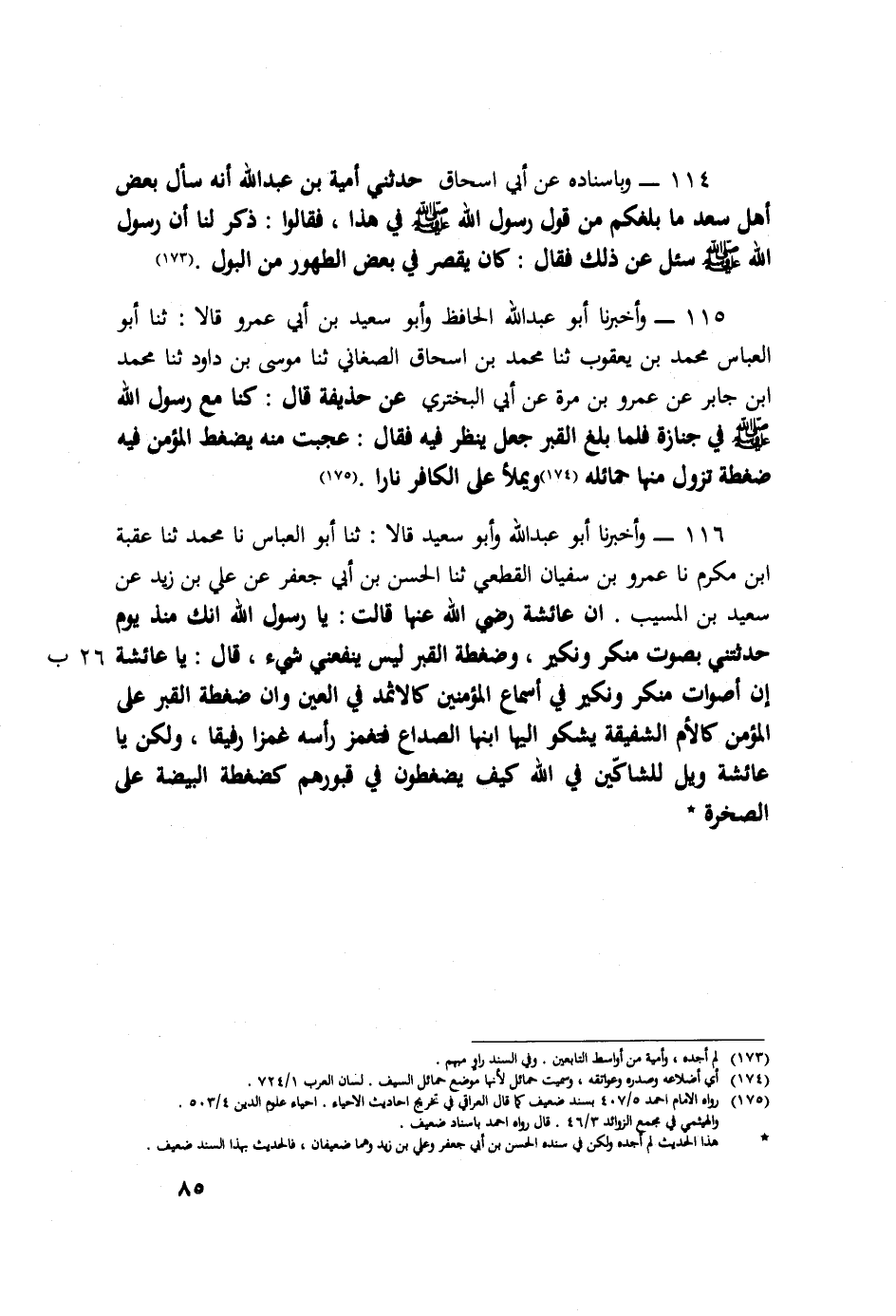116 - وَأَخْبَرَنَا أَبُو عَبْدِ اللَّهِ، وَأَبُو سَعِيدٍ قَالَا: ثَنَا أَبُو الْعَبَّاسِ، نَا مُحَمَّدٌ، ثَنَا عُقْبَةُ بْنُ مُكْرَمٍ، نَا عَمْرُو بْنُ سُفْيَانَ الْقُطَعِيُّ، ثَنَا الْحَسَنُ بْنُ أَبِي جَعْفَرٍ، عَنْ عَلِيِّ بْنِ زَيْدٍ، عَنْ سَعِيدِ بْنِ الْمُسَيِّبِ، أَنَّ عَائِشَةَ رَضِيَ اللَّهُ عَنْهَا قَالَتْ: يَا رَسُولَ اللَّهِ، إِنَّكَ مُنْذُ يَوْمِ حَدَّثْتَنِي بِصَوْتِ مُنْكَرٍ وَنَكِيرٍ وَضَغْطَةِ الْقَبْرِ لَيْسَ يَنْفَعُنِي شَيْءٌ قَالَ: «يَا عَائِشَةُ إِنَّ §أَصْوَاتَ مُنْكَرٍ وَنَكِيرٍ فِي أَسْمَاعِ الْمُؤْمِنِينَ كَالْإِثْمِدِ فِي الْعَيْنِ وَإِنَّ ضَغْطَةَ الْقَبْرِ عَلَى الْمُؤْمِنِ كَالْأُمِّ الشَّفِيقَةِ يَشْكُو إِلَيْهَا ابْنُهَا الصُّدَاعَ؛ فَتَغْمِزُ رَأْسَهُ غَمْزًا رَفِيقًا، وَلَكِنْ يَا عَائِشَةُ وَيْلٌ لِلشَّاكِّينَ فِي اللَّهِ، كَيْفَ يُضْغَطُونَ فِي قُبُورِهِمْ كَضَغْطَةِ الْبَيْضَةِ عَلَى الصَّخْرَةِ»