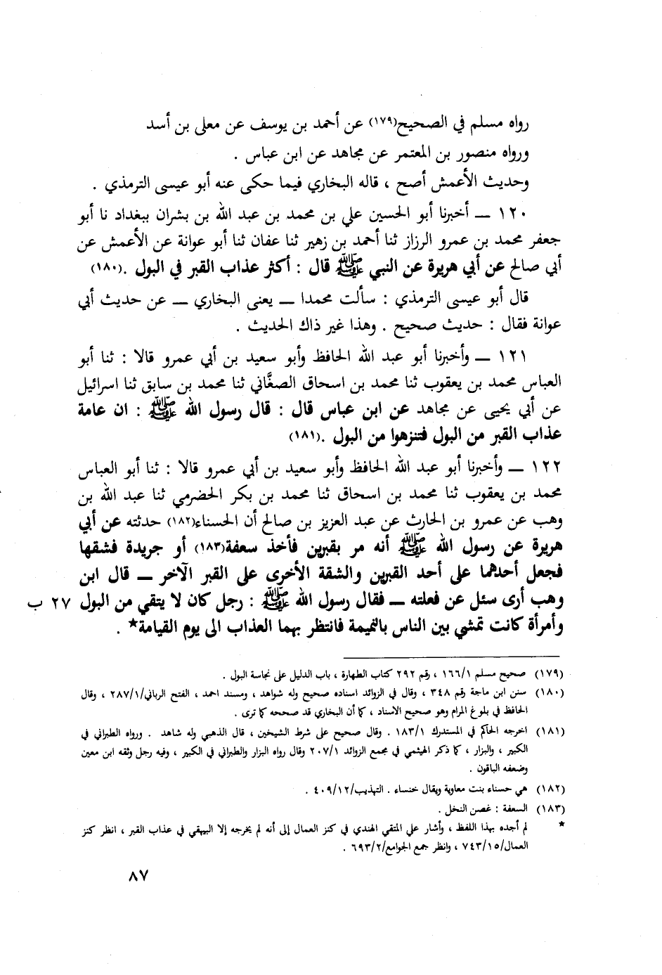 121 - وَأَخْبَرَنَا أَبُو عَبْدِ اللَّهِ الْحَافِظُ، وَأَبُو سَعِيدِ بْنُ أَبِي عَمْرٍو قَالَا: ثَنَا أَبُو الْعَبَّاسِ مُحَمَّدُ بْنُ يَعْقُوبَ، ثَنَا مُحَمَّدُ بْنُ إِسْحَاقَ الصَّغَانِيُّ، ثَنَا مُحَمَّدُ بْنُ سَابِقٍ، ثَنَا إِسْرَائِيلُ، عَنْ أَبِي يَحْيَى، عَنْ مُجَاهِدٍ، عَنِ ابْنِ عَبَّاسٍ قَالَ: قَالَ رَسُولُ اللَّهِ صَلَّى اللهُ عَلَيْهِ وَسَلَّمَ: «إِنَّ §عَامَّةَ عَذَابِ الْقَبْرِ مِنَ الْبَوْلِ، فَتَنَزَّهُوا مِنَ الْبَوْلِ»