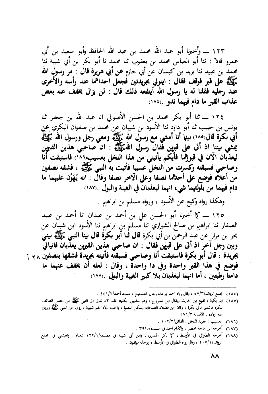 125 - كَمَا أَخْبَرَنَا أَبُو الْحَسَنِ عَلِيُّ بْنُ أَحْمَدَ بْنِ عَبْدَانَ، أَنَا أَحْمَدُ بْنُ عُبَيْدٍ الصَّفَّارُ، ثَنَا إِبْرَاهِيمُ بْنُ صَالِحٍ الشِّيرَازِيُّ، ثَنَا مُسْلِمُ بْنُ إِبْرَاهِيمَ، ثَنَا الْأَسْوَدُ بْنُ شَيْبَانَ، عَنْ بَحْرِ بْنِ مِرَارٍ، عَنْ عَبْدِ الرَّحْمَنِ بْنِ أَبِي بَكْرَةَ قَالَ: ثَنَا أَبُو بَكْرَةَ قَالَ: بَيْنَا النَّبِيُّ صَلَّى اللَّهُ عَلَيْهِ وَسَلَّم بَيْنِي وَبَيْنَ رَجُلٍ آخَرَ إِذْ أَتَى عَلَى قَبْرَيْنِ فَقَالَ: «إِنَّ §صَاحِبَيْ هَذَيْنِ الْقَبْرَيْنِ يُعَذَّبَانِ، فَأْتِيَانِي بِجَرِيدَةٍ» قَالَ أَبُو بَكْرَةَ: فَاسْتَبَقْتُ أَنَا وَصَاحِبِي فَسَبَقْتُهُ فَأَتَيْتُهُ بِجَرِيدَةٍ فَشَقَّهَا بِنِصْفَيْنِ فَوَضَعَ فِي هَذَا الْقَبْرِ وَاحِدَةً وَفِي ذَا وَاحِدَةً، وَقَالَ: «لَعَلَّهُ أَنْ يُخَفَّفَ عَنْهُمَا مَا دَامَتَا رَطْبَتَيْنِ، أَمَا إِنَّهُمَا لَيُعَذَّبَانِ بِلَا كَبِيرٍ الْغِيبَةِ وَالْبَوْلِ»