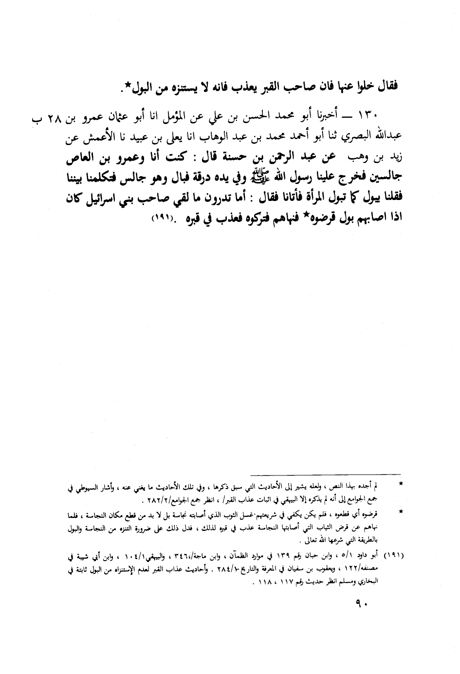 130 - أَخْبَرَنَا أَبُو مُحَمَّدٍ الْحَسَنُ بْنُ عَلِيِّ بْنِ الْمُؤَمَّلِ، أَنبَا أَبُو عُثْمَانَ عَمْرُو بْنُ عَبْدِ اللَّهِ الْبَصْرِيُّ، ثَنَا أَبُو أَحْمَدَ مُحَمَّدُ بْنُ عَبْدِ الْوَهَّابِ، أَنَا يَعْلَى بْنُ عُبَيْدٍ، نَا الْأَعْمَشُ، عَنْ زَيْدِ بْنِ وَهْبٍ، عَنْ عَبْدِ الرَّحْمَنِ بْنِ حَسَنَةَ قَالَ: كُنْتُ أَنَا وَعَمْرُو بْنُ الْعَاصِ، جَالِسَيْنِ فَخَرَجَ عَلَيْنَا رَسُولُ اللَّهِ صَلَّى اللَّهُ عَلَيْهِ وَسَلَّم وَفِي يَدِهِ دَرَقَةٌ، فَبَالَ وَهُوَ جَالِسٌ فَتَكَلَّمْنَا بَيْنَنَا فَقُلْنَا: يَبُولُ كَمَا تَبُولُ الْمَرْأَةُ، فَأَتَانَا فَقَالَ: «§أَمَا تَدْرُونَ مَا لَقِيَ صَاحِبُ بَنِي إِسْرَائِيلَ، كَانَ إِذَا أَصَابَهُمْ بَوْلٌ قَرَضُوهُ فَنَهَاهُمْ فَتَرَكُوهُ فَعُذِّبَ فِي قَبْرِهِ»