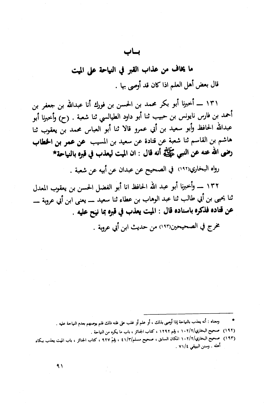 131 - أَخْبَرَنَا أَبُو بَكْرٍ مُحَمَّدُ بْنُ الْحَسَنِ بْنِ فُورَكٍ، أَنَا عَبْدُ اللَّهِ بْنُ جَعْفَرِ بْنِ أَحْمَدَ بْنِ فَارِسٍ، نَا يُونُسُ بْنُ حَبِيبٍ، ثَنَا أَبُو دَاوُدَ الطَّيَالِسِيُّ، ثَنَا شُعْبَةُ، ح، وَأَخْبَرَنَا أَبُو عَبْدِ اللَّهِ الْحَافِظُ، وَأَبُو سَعِيدِ بْنُ أَبِي عَمْرٍو قَالَا: ثَنَا أَبُو الْعَبَّاسِ مُحَمَّدُ بْنُ يَعْقُوبَ، ثَنَا هَاشِمُ بْنُ الْقَاسِمِ، ثَنَا شُعْبَةُ، عَنْ قَتَادَةَ، عَنْ سَعِيدِ بْنِ الْمُسَيِّبِ، عَنْ عُمَرَ بْنِ الْخَطَّابِ رَضِيَ اللَّهُ عَنْهُ عَنِ النَّبِيِّ صَلَّى اللهُ عَلَيْهِ وَسَلَّمَ أَنَّهُ قَالَ: «إِنَّ §الْمَيِّتَ لَيُعَذَّبُ فِي قَبْرِهِ بِالنِّيَاحَةِ» رَوَاهُ الْبُخَارِيُّ فِي الصَّحِيحِ عَنْ عَبْدَانَ عَنْ أَبِيهِ عَنْ شُعْبَةَ،