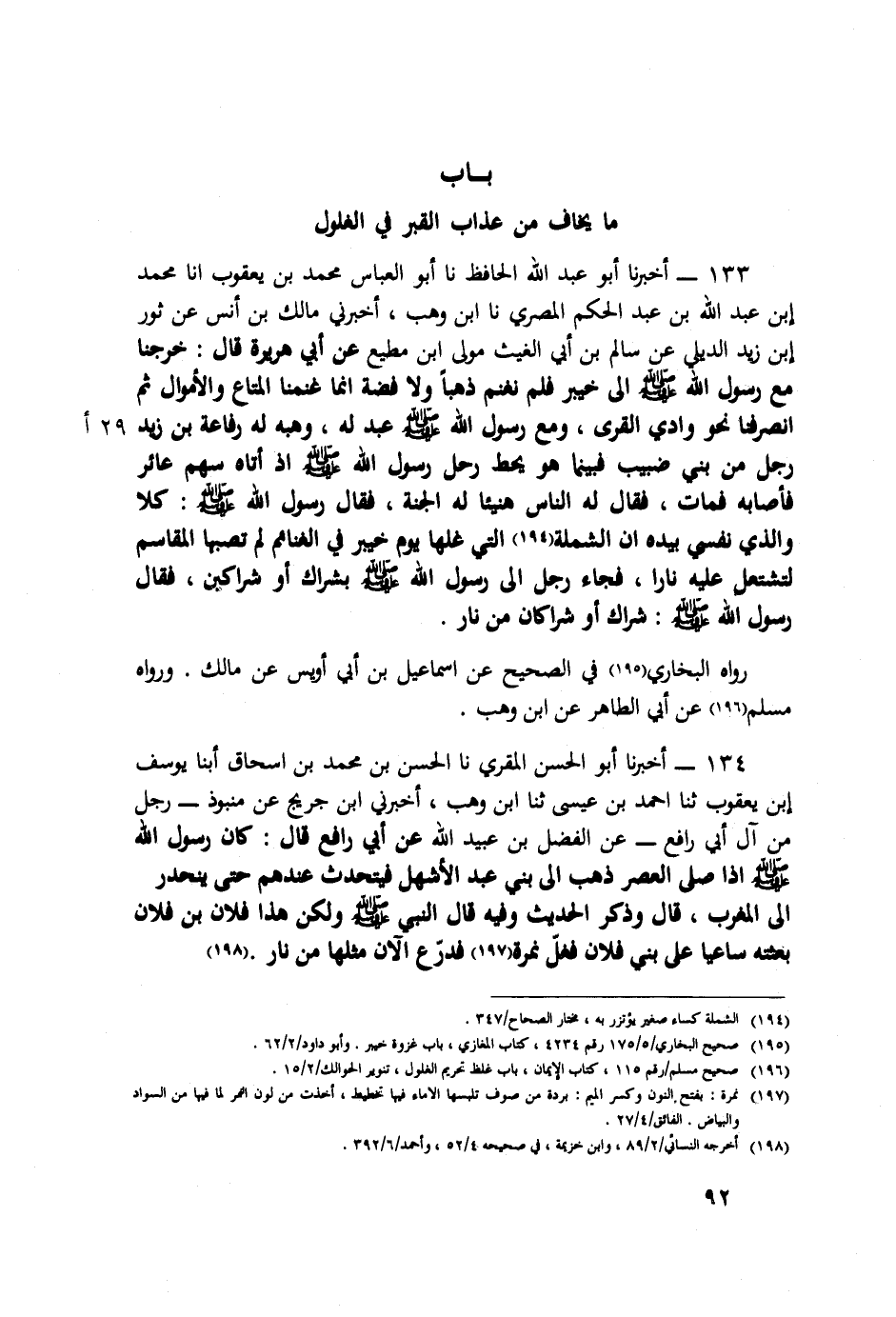133 - أَخْبَرَنَا أَبُو عَبْدِ اللَّهِ الْحَافِظُ، نَا أَبُو الْعَبَّاسِ مُحَمَّدُ بْنُ يَعْقُوبَ، أَنَا مُحَمَّدُ بْنُ عَبْدِ اللَّهِ بْنِ عَبْدِ الْحَكَمِ الْمِصْرِيُّ، نَا ابْنُ وَهْبٍ، أَخْبَرَنِي مَالِكُ بْنُ أَنَسٍ، عَنْ ثَوْرِ بْنِ زَيْدٍ الدُّئَلِيُّ، عَنْ سَالِمِ أَبِي الْغَيْثِ مَوْلَى ابْنِ مُطِيعٍ، عَنْ أَبِي هُرَيْرَةَ قَالَ: خَرَجْنَا مَعَ رَسُولِ اللَّهِ صَلَّى اللهُ عَلَيْهِ وَسَلَّمَ إِلَى خَيْبَرَ، فَلَمْ نَغْنَمْ ذَهَبًا وَلَا فِضَّةً، إِنَّمَا غَنِمْنَا الْمَتَاعَ وَالْأَمْوَالَ، ثُمَّ انْصَرَفْنَا نَحْوَ وَادِي الْقُرَى وَمَعَ رَسُولِ اللَّهِ صَلَّى اللهُ عَلَيْهِ وَسَلَّمَ عَبْدٌ لَهُ وَهَبَهُ إِيَّاهُ رِفَاعَةُ بْنُ زَيْدٍ، رَجُلٌ مِنْ بَنِي ضَبِيبٍ، فَبَيْنَمَا هُوَ يَحُطُّ رَحْلَ رَسُولِ اللَّهِ صَلَّى اللهُ عَلَيْهِ وَسَلَّمَ إِذْ أَتَاهُ سَهْمٌ عَاثِرٌ فَأَصَابَهُ فَمَاتَ، فَقَالَ لَهُ النَّاسُ: هَنِيئًا لَهُ الْجَنَّةُ، فَقَالَ رَسُولُ اللَّهِ صَلَّى اللهُ عَلَيْهِ وَسَلَّمَ: «كَلَّا وَالَّذِي نَفْسِي بِيَدِهِ، إِنَّ §الشَّمْلَةَ الَّتِي غَلَّهَا يَوْمَ خَيْبَرٍ مِنَ الْمَغَانِمِ لَمْ تُصِبْهَا الْمَقَاسِمُ لَتَشْتَعِلُ عَلَيْهِ نَارًا» فَجَاءَ رَجُلٌ إِلَى رَسُولِ اللَّهِ صَلَّى اللهُ عَلَيْهِ وَسَلَّمَ بِشِرَاكٍ أَوْ شِرَاكَيْنِ، فَقَالَ رَسُولُ اللَّهِ صَلَّى اللهُ عَلَيْهِ وَسَلَّمَ: «شِرَاكٌ أَوْ شِرَاكَانِ مِنْ نَارٍ» رَوَاهُ الْبُخَارِيُّ فِي الصَّحِيحِ عَنْ إِسْمَاعِيلَ بْنِ أَبِي أُوَيْسٍ عَنْ مَالِكٍ، وَرَوَاهُ مُسْلِمٌ عَنْ أَبِي الطَّاهِرِ عَنِ ابْنِ وَهْبٍ