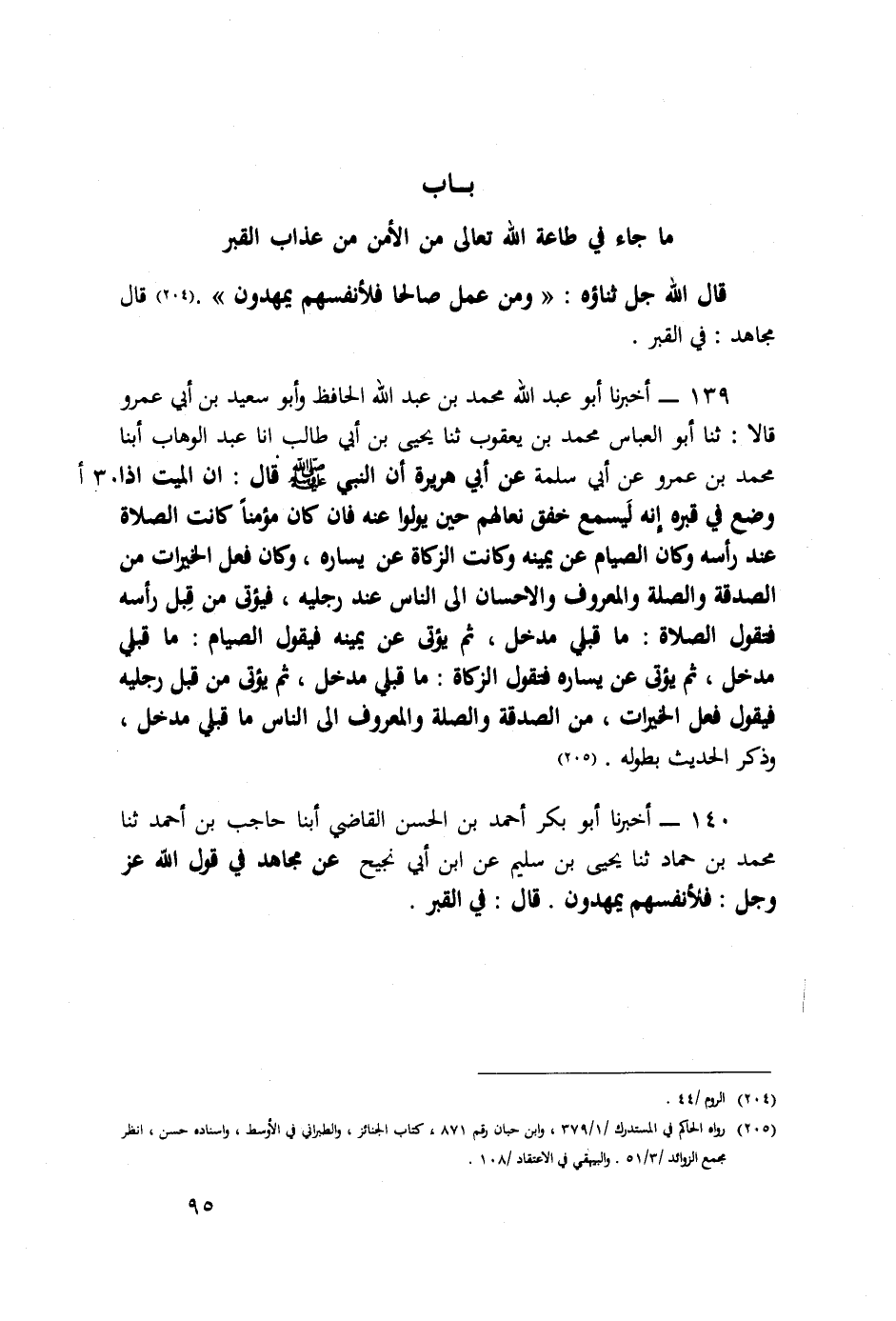 139 - أَخْبَرَنَا أَبُو عَبْدِ اللَّهِ مُحَمَّدُ بْنُ عَبْدِ اللَّهِ الْحَافِظُ وَأَبُو سَعِيدِ بْنُ أَبِي عَمْرٍو قَالَا: ثَنَا أَبُو الْعَبَّاسِ مُحَمَّدُ بْنُ يَعْقُوبَ، ثَنَا يَحْيَى بْنُ أَبِي طَالِبٍ، أَنَا عَبْدُ الْوَهَّابِ، نَا مُحَمَّدُ بْنُ عَمْرٍو، عَنْ أَبِي سَلَمَةَ، عَنْ أَبِي هُرَيْرَةَ أَنَّ النَّبِيَّ صَلَّى اللهُ عَلَيْهِ وَسَلَّمَ قَالَ: " إِنَّ §الْمَيِّتَ إِذَا وُضِعَ فِي قَبْرِهِ إِنَّهُ لَيَسْمَعُ خَفْقَ نِعَالِهِمْ حِينَ يُوَلُّوا عَنْهُ، فَإِنْ كَانَ مُؤْمِنًا كَانَتِ الصَّلَاةُ عِنْدَ رَأْسِهِ، وَكَانَ الصِّيَامُ عَنْ يَمِينِهِ، وَكَانَ الزَّكَاةُ عَنْ يَسَارِهِ، وَكَانَ فِعْلُ الْخَيْرَاتِ مِنَ الصَّدَقَةِ وَالصِّلَةِ وَالْمَعْرُوفِ وَالْإِحْسَانِ إِلَى النَّاسِ عِنْدَ رِجْلَيْهِ، فَيُؤْتَى مِنْ قِبَلِ رَأْسِهِ، فَتَقُولُ الصَّلَاةُ: مَا قِبَلِي مَدْخَلٌ، ثُمَّ يُؤْتَى عَنْ يَمِينِهِ فَيَقُولُ الصِّيَامُ: مَا قِبَلِي مَدْخَلٌ، ثُمَّ يُؤْتَى عَنْ يَسَارِهِ فَتَقُولُ الزَّكَاةُ: مَا قِبَلِي مَدْخَلٌ، ثُمَّ يُؤْتَى مِنْ قِبَلِ رِجْلَيْهِ فَيَقُولُ فِعْلُ الْخَيْرَاتِ مِنَ الصَّدَقَةِ وَالصِّلَةِ وَالْمَعْرُوفِ إِلَى النَّاسِ: مَا قِبَلِي مَدْخَلٌ " وَذَكَرَ الْحَدِيثَ بِطُولِهِ