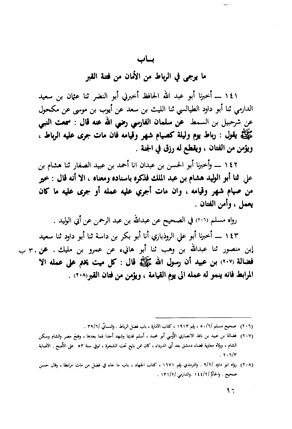 143 - أَخْبَرَنَا أَبُو عَلِيٍّ الرُّوذْبَارِيُّ، أَنَا أَبُو بَكْرِ بْنُ دَاسَةَ، ثَنَا أَبُو دَاوُدَ، ثَنَا سَعِيدُ بْنُ مَنْصُورٍ، ثَنَا عَبْدُ اللَّهِ بْنُ وَهْبٍ، ثَنَا أَبُو هَانِئٍ، عَنْ عَمْرِو بْنِ مَالِكٍ، عَنْ فَضَالَةَ بْنِ عُبَيْدٍ أَنَّ رَسُولَ اللَّهِ صَلَّى اللهُ عَلَيْهِ وَسَلَّمَ قَالَ: §«كُلُّ مَيِّتٍ يُخْتَمُ عَلَى عَمَلِهِ إِلَّا الْمُرَابِطَ، فَإِنَّهُ يَنْمُو لَهُ عَمَلُهُ إِلَى يَوْمِ الْقِيَامَةِ، وَيُؤَمَّنُ مِنْ فَتَّانِ الْقَبْرِ»