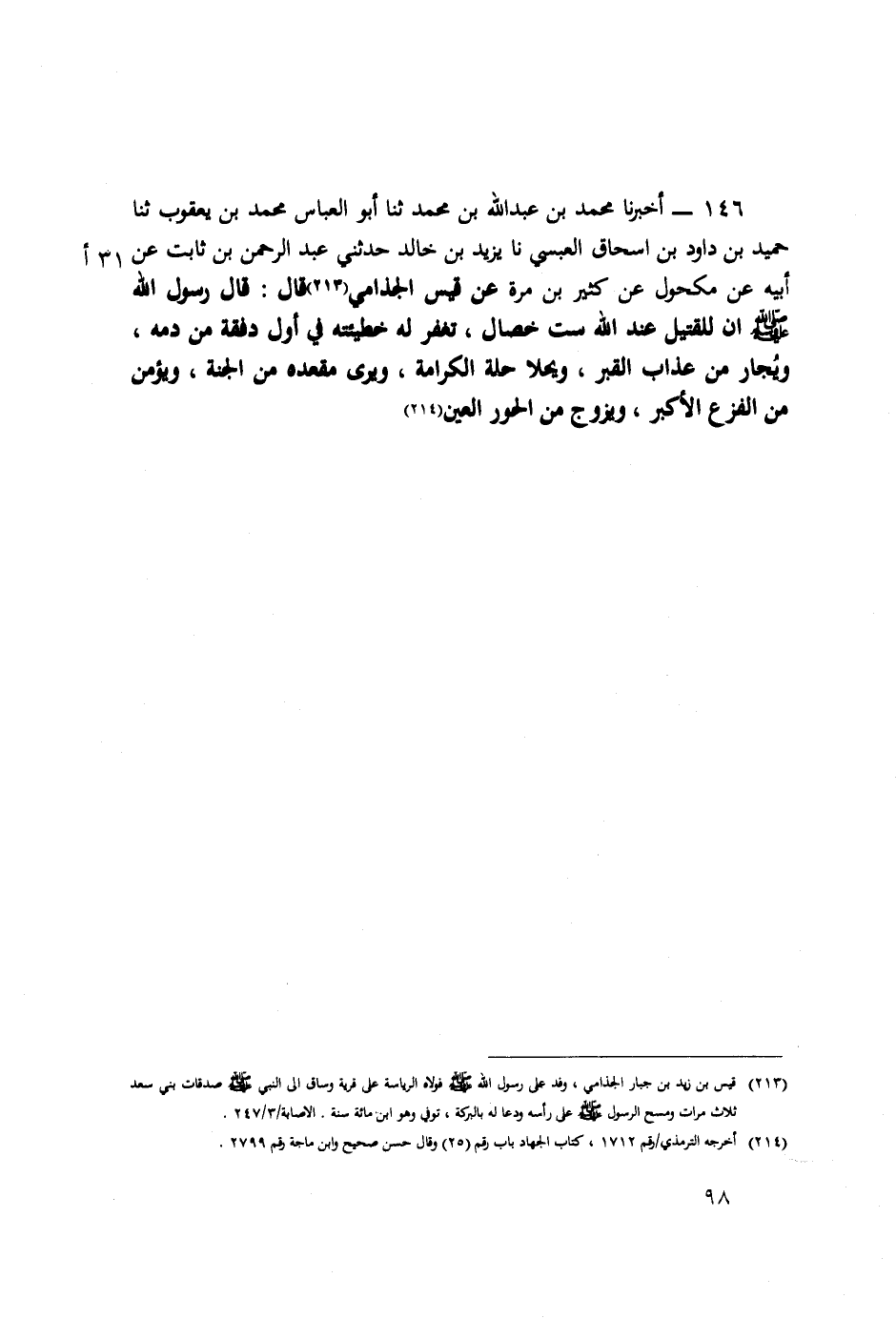 146 - أَخْبَرَنَا مُحَمَّدُ بْنُ عَبْدِ اللَّهِ بْنِ مُحَمَّدٍ، ثَنَا أَبُو الْعَبَّاسِ مُحَمَّدُ بْنُ يَعْقُوبَ، ثَنَا حُمَيْدُ بْنُ دَاوُدَ بْنِ إِسْحَاقَ الْعَبْسِيُّ، نَا يَزِيدُ بْنُ خَالِدٍ، حَدَّثَنِي عَبْدُ الرَّحْمَنِ بْنُ ثَابِتٍ، عَنْ أَبِيهِ، عَنْ مَكْحُولٍ، عَنْ كَثِيرِ بْنِ مُرَّةَ، عَنْ قَيْسٍ الْجُذَامِيِّ قَالَ: قَالَ رَسُولُ اللَّهِ صَلَّى اللهُ عَلَيْهِ وَسَلَّمَ: «إِنَّ §لِلْقَتِيلِ عِنْدَ اللَّهِ سِتَّ خِصَالٍ، تُغْفَرُ لَهُ خَطِيئَتُهُ فِي أَوَّلِ دَفْقَةٍ مِنْ دَمِهِ، وَيُجَارُ مِنْ عَذَابِ الْقَبْرِ، وَيُحَلَّى حُلَّةَ الْكَرَامَةِ وَيَرَى مَقْعَدَهُ مِنَ الْجَنَّةِ، وَيُؤَمَّنُ مِنَ الْفَزَعِ الْأَكْبَرِ، وَيُزَوَّجُ مِنَ الْحُورِ الْعَيْنِ»