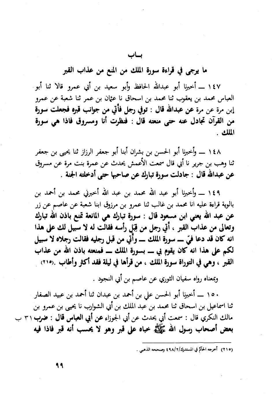 147 - أَخْبَرَنَا أَبُو عَبْدِ اللَّهِ الْحَافِظُ، وَأَبُو سَعِيدِ بْنُ أَبِي عَمْرٍو قَالَا: ثَنَا أَبُو الْعَبَّاسِ مُحَمَّدُ بْنُ يَعْقُوبَ، ثَنَا مُحَمَّدُ بْنُ إِسْحَاقَ، نَا عُثْمَانُ بْنُ عُمَرَ، ثَنَا شُعْبَةُ، عَنْ عَمْرِو بْنِ مُرَّةَ، عَنْ مُرَّةَ، عَنْ عَبْدِ اللَّهِ قَالَ: تُوُفِّيَ رَجُلٌ فَأُتِيَ مِنْ جَوَانِبِ قَبْرِهِ، §فَجَعَلَتْ سُورَةٌ مِنَ الْقُرْآنِ تُجَادِلُ عَنْهُ حَتَّى مَنَعَتْهُ قَالَ: فَنَظَرْتُ أَنَا وَمَسْرُوقٌ فَإِذَا هِيَ سُورَةُ الْمُلْكِ "