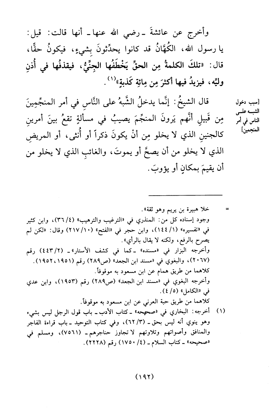 الْغَيْثَ} [لقمان: 34] ، وَلَمْ يَذْكُرِ اللَّهُ تَعَالَى أَنَّ عِنْدَهُ عِلْمَ هَذِهِ الأَشْيَاءِ وَفِي خَلْقِهِ مَنْ يَعْلَمُهَا كَعِلْمِهِ، وَلَوْ كَانَ فِي خَلْقِهِ مَنْ يَعْلَمُهَا كَعِلْمِهِ مَا كَانَ لِوَصْفِهِ نَفْسَهُ بِالْعِلْمِ بِهَا مَوْقِعٌ يَخْتَصُّ بِالتَّسْلِيمِ إِلَيْهِ، لِمُشَارَكَةِ خَلْقِهِ فِيهَا، وَلا إِفَادَةَ لِلْمُتَصَفِّحِ قَرَاءَتَهَا، وَإِذَا اشْتَرَكَ الْخَالِقُ وَالْمَخْلُوقُ فِي شَيْءٍ، فَكَيْفَ يَتَبَيَّنُ الْقَادِرُ مِنْهُمَا وَالْعَاجِزُ فِيهِمَا عَلَى أَوْضَاعِ الْمُنَجِّمِينَ وَهُمْ قَدْ شَارَكُوا رَبَّ الْعَالَمِينَ تَبَارَكَ وَتَعَالَى فِي عِلْمِ هَذِهِ الأُمُورِ؟ لأَنَّ مِنْهُمْ مَنْ يُخْبِرُ أَنَّ طُوفَانَ نَارٍ يَكُونُ فِي آخِرِ الزَّمَانِ فِي وَقْتٍ بِعَيْنِهِ يَحُدُّهُ يَأْتِي عَلَى الْخَلْقِ يَنْتَثِرُ لَهُ الْكَوَاكِبُ، فَالْمُظْهِرُ لِلتَّمَسُّكِ بِالشَّرْعِ مِنْهُمْ يَقُولُ: إِنَّهُ الْقِيَامَةُ الَّتِي ذَكَرَهَا اللَّهُ تَعَالَى وَيَتَكَلَّمُونَ أَيْضًا فِي الْغَيْثِ وَفِي تَحَاوِيلِ السِّنِينَ، وَيَحْكُمُونَ عَلَى الْجَنِينِ فِي بَطْنِ أُمِّهِ مِنْ طَالِعٍ يُؤْخَذُ لِلْوَقْتِ أَوْ كَانَ أُخِذَ لِسُقُوطِ النُّطْفَةِ، فَيَقُولُونَ ذَكَرٌ هُوَ أَوْ أُنْثَى، وَمَتَى تُلْقِيهِ أُمُّهُ، وَيَتَحَقَّقُونَ بِحُكْمِهِمْ مُدَّةَ عُمُرِهِ وَمَا يَكُونُ حِرْفَتُهُ، وَأَيُّ شَيْءٍ يَصِيرُ إِلَيْهِ مِنْ كَسْبِهِ، وَأَيْنَ يَكُونُ مَنِيَّتُهُ.